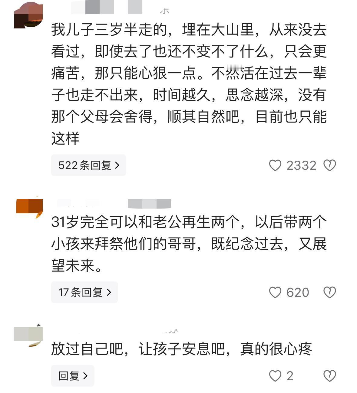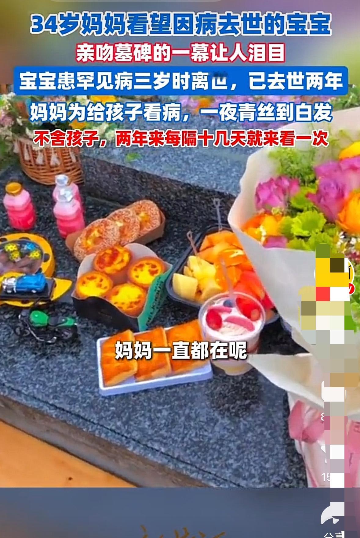 太可怜了,一位白发苍苍的妈妈,实际年龄只有34岁,她站在孩子的墓碑前与孩子聊天,让人泪目。 孩子3岁得了罕见病去世,而这位妈妈在给孩子看病时一夜白了头,如今她只能现在孩子的墓碑前,与孩子聊聊天,问她有没有买新衣服,拿着她最爱吃的零食。 妈妈亲吻墓碑的举动,更是让很多为人父母的接受不了,很多人劝她:你还年轻,未来还有很多年要过,放过自己吧。 孩子去世的这两年,这位母亲每隔十几天都会来看她,一直还没有从丧子的伤痛中走出来。 人生最痛苦的事情莫过于白发人送黑发人,希望这位母亲能够早日走出阴影,接纳丧子的事实。