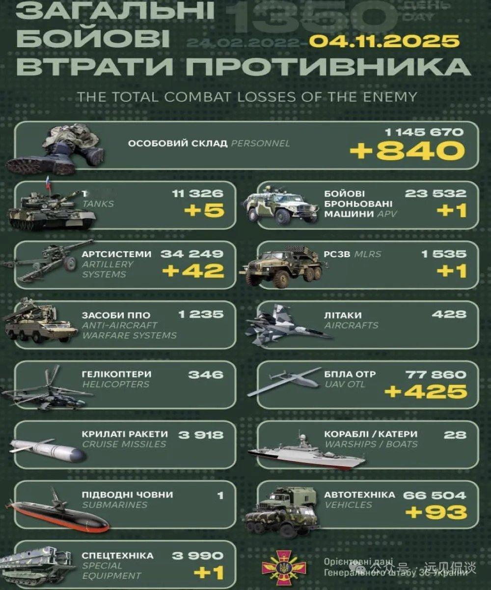 【2025年11 月 4 日乌克兰战报】乌方每天发布而且有累计数,具有连贯性,至少可以看合订本。也欢迎大家转发俄罗斯官方发布带有累计数的每日战报。
