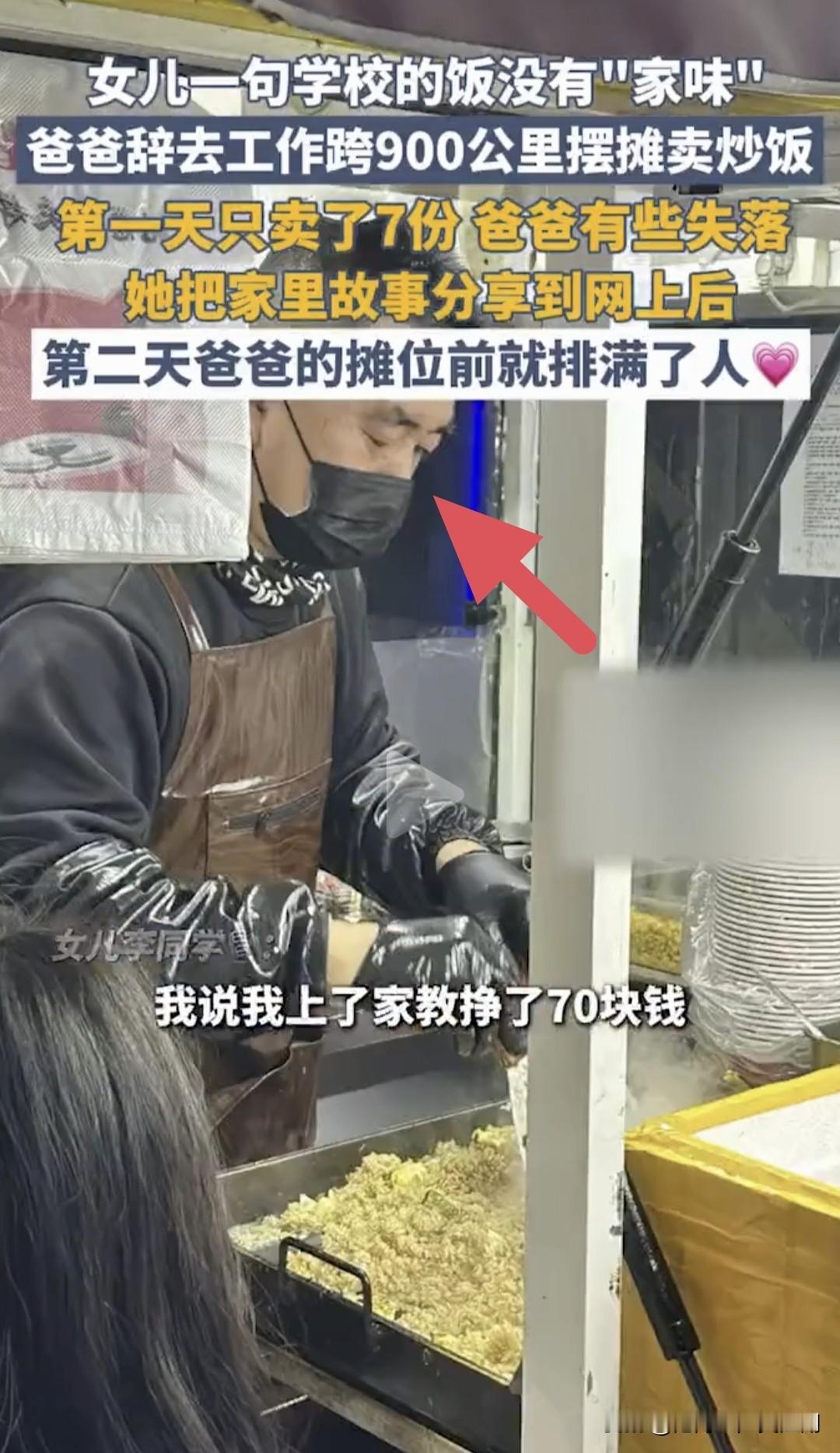 瞬间泪目, 这绝对是全网最最好吃的“父爱”牌炒饭! 都说父爱如山“崩地裂”,这位爸爸却完美的诠释了父爱依然可以温柔细腻。宝贝女儿考到外地上大学,一句学校的炒饭不太好吃,爸爸就辞去工作,跨越几百公里,跑到女儿学校门口租了个摊位卖炒饭,第一天挣得钱还不如女儿勤工俭学做家教挣得多,女儿把这个温情故事发到网上后,瞬间火遍全网,第二天爸爸的摊位前便排起了长龙。 只要有爱,单亲家庭一样可以把生活过得有滋有味,温情暖暖。正如女孩的大学同学说的那样:这炒饭有股熟悉的味道,不是难吃,而是有股“爸爸”味。
