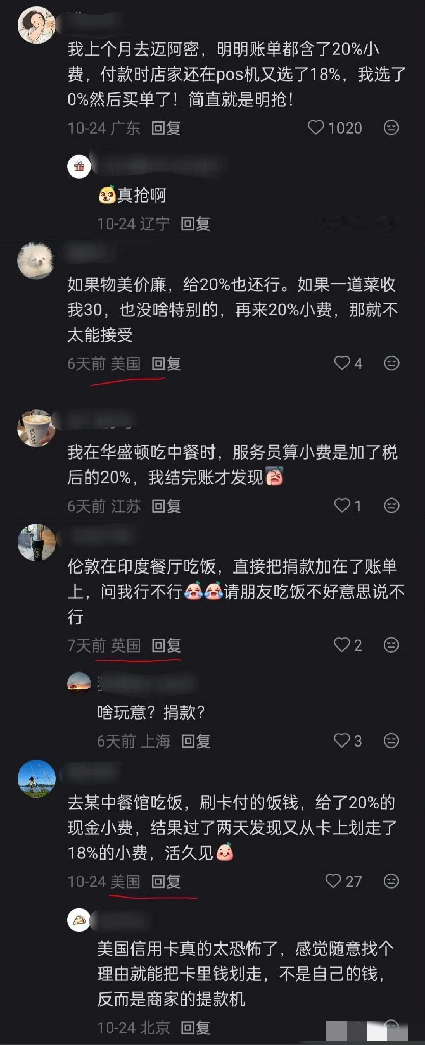美国小费文化已经失控到恐怖的地步了,有网友去中餐馆吃饭,服务员主动把小费填了20%,甚至有的服务员小费是算税后的,还会遇到被重复收取小费的套路。在英国的印度餐厅吃饭,甚至遇到把捐款加在了账单上。[尬笑]中美小费文化 美国小费 额外小费