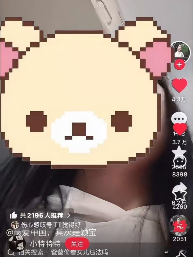 那个“女孩控诉洗澡时被爸爸故意开门看”的视频上了热门,我的看法是,大概率是假的,表演痕迹较重,语气像是说台词。当然,即便再大的概率,也不能就不当回事,相关部门该查还是要查,如果是真的,提前介入就可能起到保护作用,如果是假的,建议追究造假者的责任。