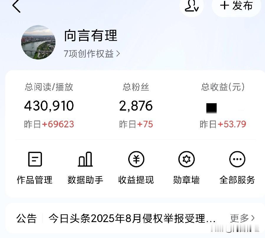 每天更新内容,就像每天散步一样自然。刚开始,收益可能很小,比如10月28日只有5.11元,10月29日是2.66元。但是,只要坚持下去,就会看到回报。 到了11月初,收益明显增长。11月1日达到了32.77元,11月2日更是涨到了53.79元。这些数字告诉我们,坚持创作真的有价值。 真实的内容能打动人心。每天的坚持,让平凡的内容积累出价值。坚持发声,就会被更多人看见。这就是坚持创作的回报轨迹。 所以,不要放弃每天的创作。每一步都是在积累价值,每一点努力都会被看见。坚持下去,你会收获更多的回报。创作收益 每日创作话题