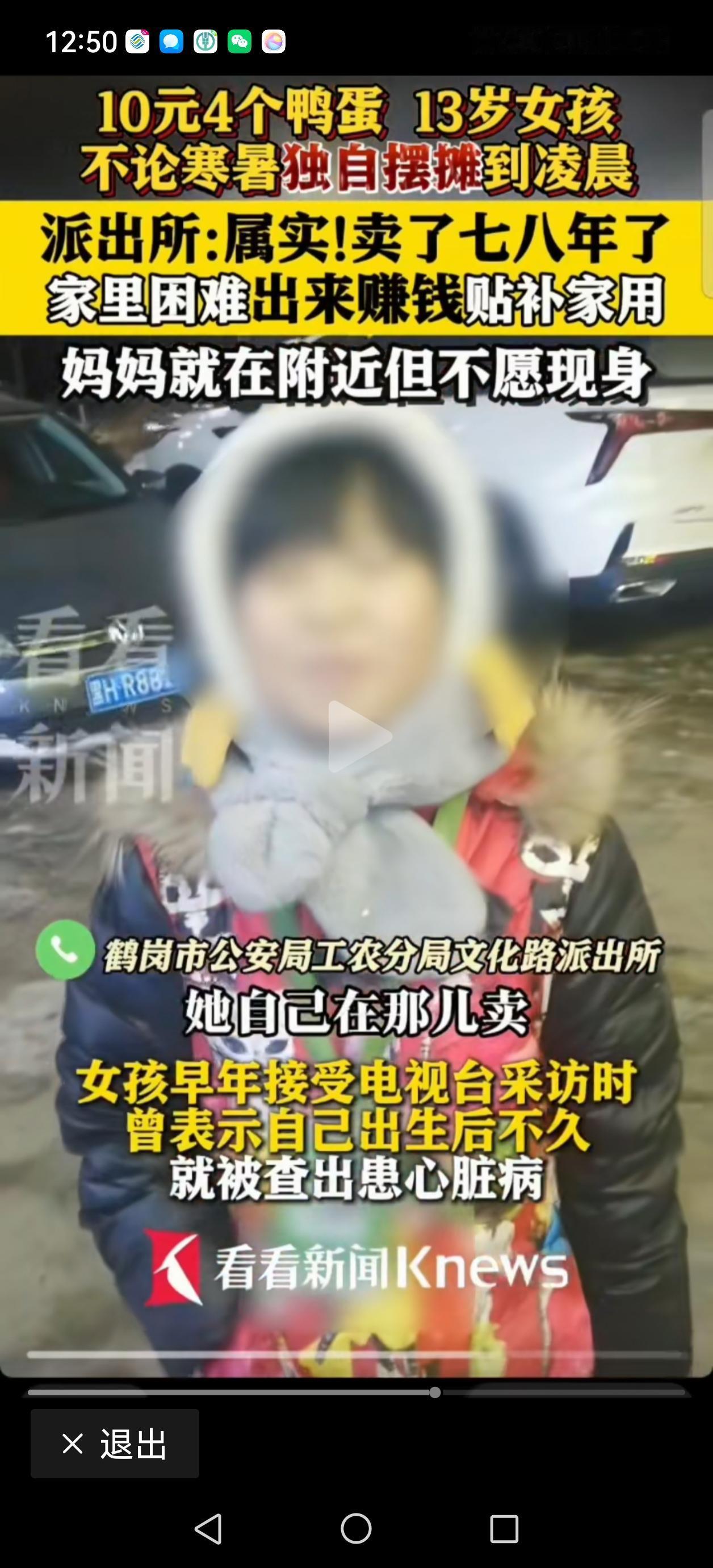很心酸!看到这样的消息! 我也曾经卖过鸡蛋,自家母鸡下的,周末的时候用小篮子提着走一个小时的山路到集镇上去卖。到那是40年前的了。 10年前我女儿这个年纪的时候,也让她在小区门口摆过小摊,卖自家开过了的昙花。但她是为了好玩。 而这个小女孩,是实实在在地在卖鸭蛋,为了生活。 国家很大,区域发展很不平衡,难免还是会有些人生活不济,这个大家都理解。 可是我们不理解的是,当我们自己的孩子还在忍饥受穷的时候,却还要花巨资邀请那些所谓友邦的浪子来华读书。我们的发展到底是为了谁? 鹤岗 警方回应13岁女孩深夜独自街头卖鸭蛋