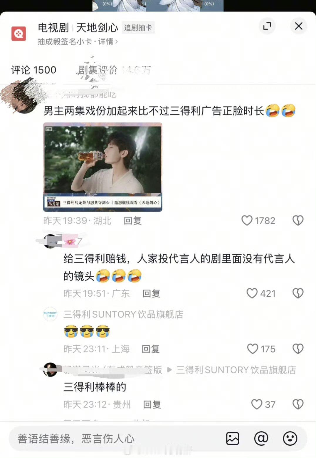 有网友评论天地剑心成毅男主两集戏份加起来比不过三得利广告正脸时长,三得利还回复了两个哭哭的表情,品牌都看不下去了吧[允悲]
