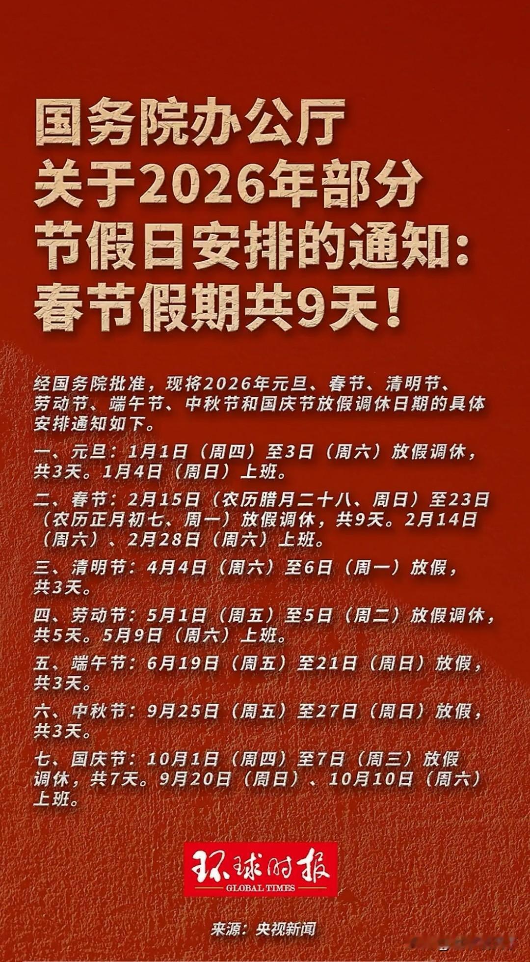 国务院办公厅刚发布2026年节假日安排啦! 春节假期直接飙到9天, 元旦、清明、端午、中秋各3天, 劳动节5天, 国庆节7天。 这么多假期, 可得提前规划规划, 是来场说走就走的旅行, 还是宅家躺平回血, 赶紧盘一盘, 别浪费了这大好时光哦~ 法定节假日安排 全国假期安排 长假措施 国家放假安排 全国放年假 春节假期天数 节日放假安排