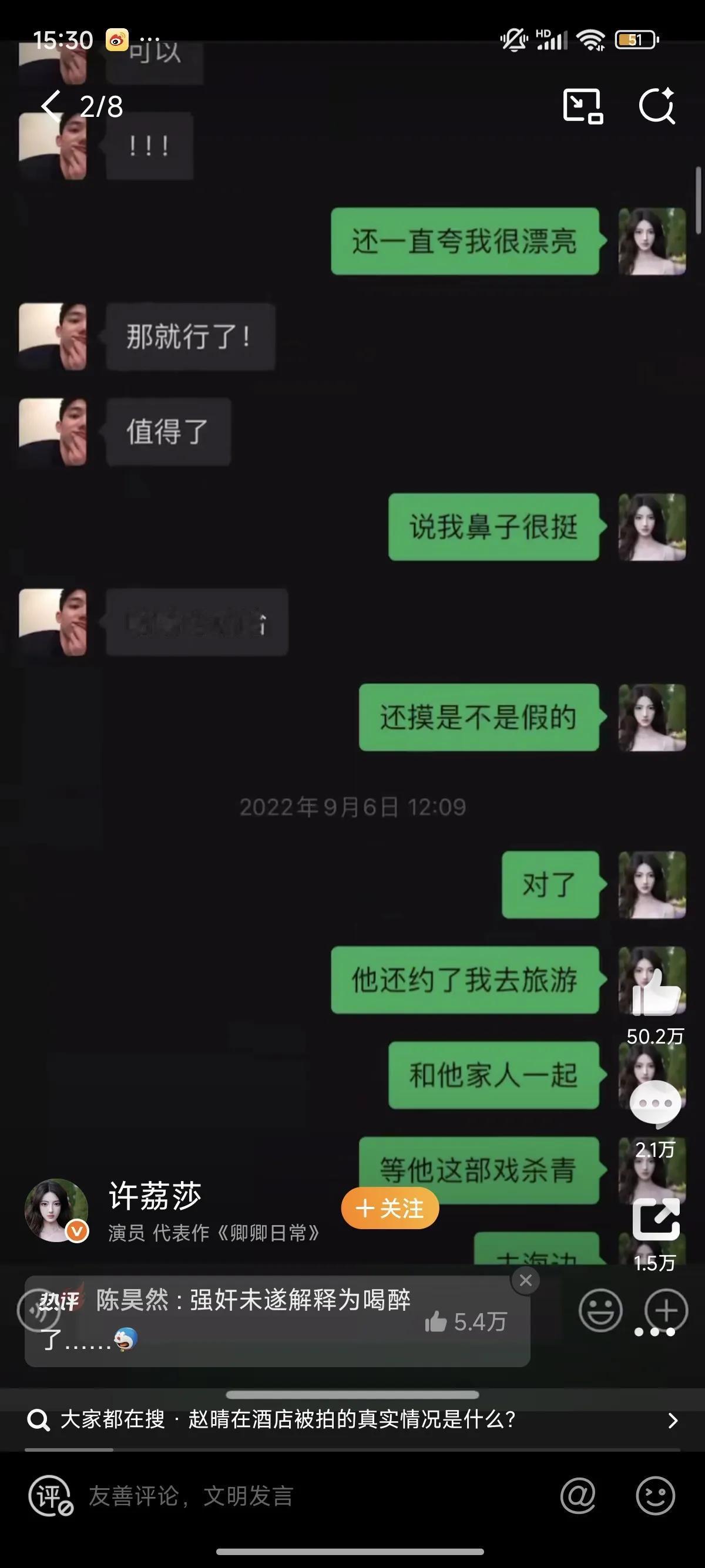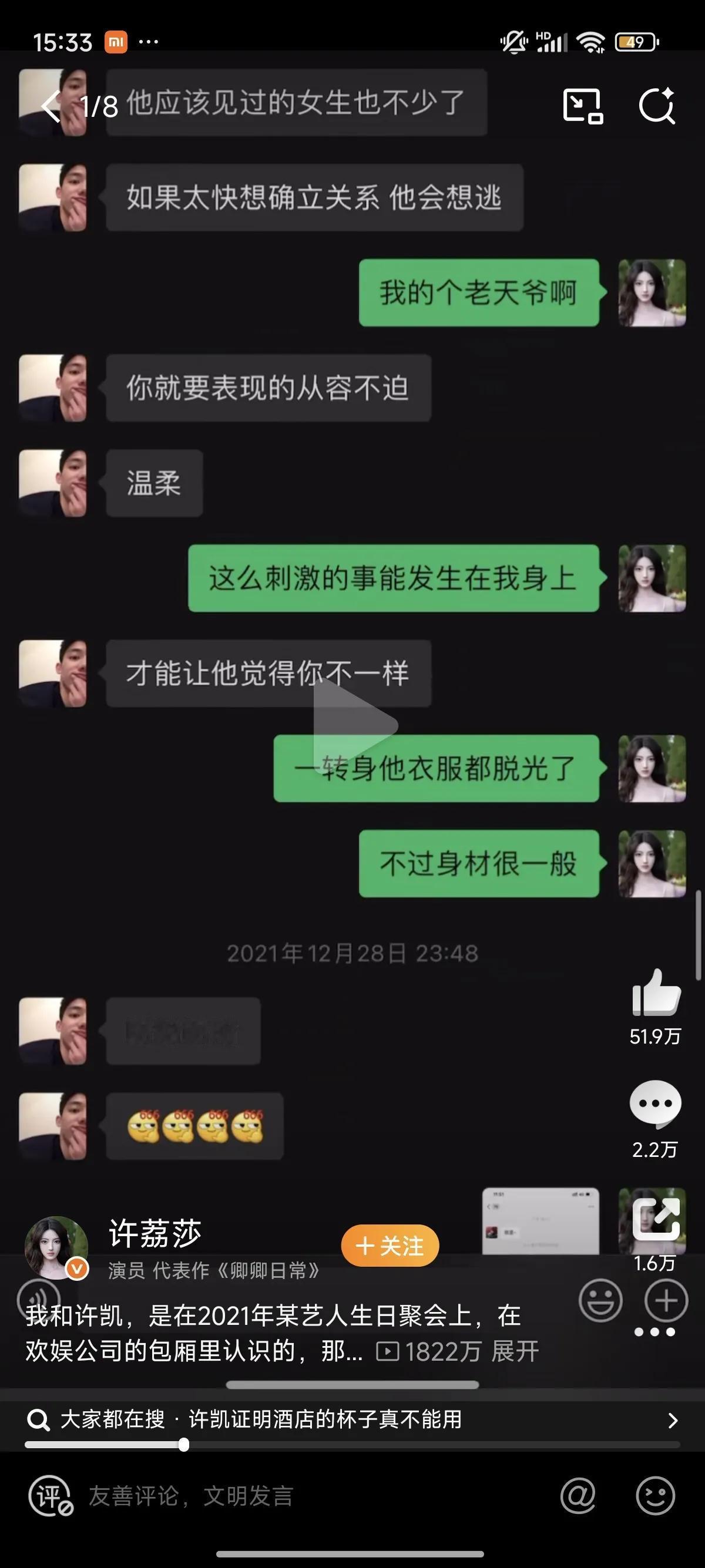 许凯前女友爆锤劈腿成性!酒店强吻、连环出轨、冷暴力,时间线全梳理 “他把自己衣服脱了,我被吓飞了”“用当时对待我的方式对待同组女演员”“说我是黑寡妇,骂我恶心死了”——许凯前女友亲述两年恋爱血泪史,信息量爆炸! 2025年8月,许凯前女友发布长文爆料,详细揭露与许凯两年恋爱期间多次遭背叛的经历。据其自述,二人2021年在某艺人生日聚会相识,次日许凯便在家中酒醉后强吻并脱衣,吓跑女方。后经送礼道歉,两人开始交往。 时间线梳理: 1. 2022年12月:许凯与赵晴因“同进酒店”上热搜,当时正牌女友却在重庆隔离阳性发烧,崩溃发匿名小号; 2. 2023年2月:许凯进新组后追求同组女演员,带至商K会所喝酒后回酒店套房重复“强吻脱衣”操作,女方逃跑; 3. 2023年夏:对同组女演员冷暴力后又搭上新女生; 4. 2023年10月:再次加回前女友微信谎称单身,被发现后通过经纪人骂她“黑寡妇”“恶心死了”。 前女友强调两年间未获一句道歉,唯一一笔6000元转账实为朋友牌局输钱代转。此次爆料导火索是建群要道歉被许凯直接退群,终于忍无可忍。