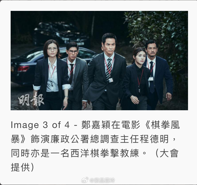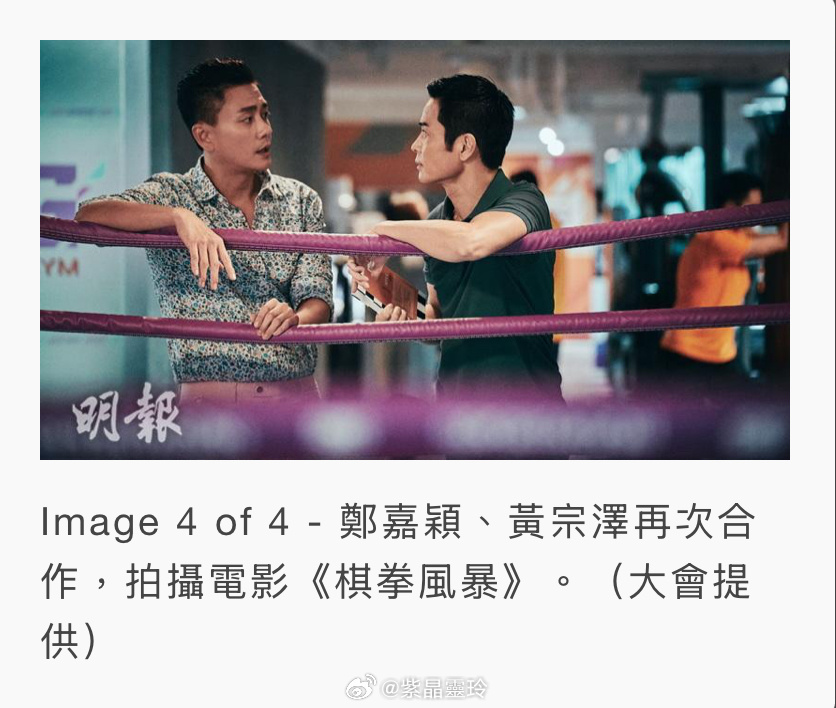 鄭嘉穎、胡鴻鈞、劉心悠、黃宗澤、盧海鵬等,主演的電影《棋拳風暴》將於下周四(13日)上映。鄭嘉穎在戲中飾演廉政公署(ICAC)總調查主任程德明,同時亦是一名西洋棋拳擊教練,帶領由胡鴻鈞飾演的徒弟文淵參與棋拳比賽。嘉穎對首次拍攝電影的胡鴻鈞讚不絕口:「我覺得他很敬業,要在收到劇本後一個月內操成像一個拳手的身形絕對不容易,加上他在沒有拍過動作戲的情况下,演繹角色上表現得很好!」