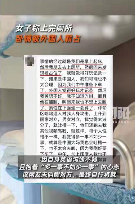 10月29日,一女乘客乘坐广西到上海的列车,因为中途去卫生间短时间的离开,回来发现自己的卧铺,被一名印度男子霸占! 深夜的列车晃悠悠地穿行在夜色里,广西开往上海的车厢内灯光已调至昏暗,大多数乘客都裹着被子熟睡,只有过道里偶尔传来乘务员巡视的脚步声。 10月29日,一名女乘客揉着惺忪的睡眼从卫生间回来,却在自己的卧铺前愣住了。 原本属于她的铺位上,一名外籍乘客正盖着她的被子酣睡,嘴角甚至还挂着浅浅的口水痕,她放在床头的耳机被挤到了地板缝里。 她试着用简单的英语轻声提醒,对方翻了个身继续睡,仿佛没听见。 看着周围乘客投来的零星目光,女子的脸颊有点发烫,心里那点“多一事不如少一事”的念头冒了出来。 于是她捡起耳机,在过道的折叠椅上坐下,这一坐就是三个小时,然而直到临近中午下车,也没再叫醒对方。 这段随手拍的吐槽视频,没想到成了引爆网络的导火索,这段看似不起眼的旅途小插曲,却在网络上掀起了轩然大波。 评论区很快分成了几派:有人骂她“太怂”,觉得不该轻易妥协;也有人特别理解,说自己遇到类似情况也会犹豫,“怕说不清楚反而闹僵”。 她后来解释,其实要是中国乘客占了座,她大概率也就算了,只是因为对方是外国人,才随手记录下来。 就在大家各执一词时,12306的官方回应给这场争论划上了清晰的指引。 客服在接受采访时语气坚定,遇到床位被占、信息不符等情况,完全无需妥协,第一时间联系列车乘务员或乘警就行。 客服特意提到,乘务员都经过专业培训,至少能应对基础的英语沟通。 就算碰到复杂情况也不用慌,乘警手机里装着实时翻译软件,连方言都能搞定,列车长还备着双语版的《铁路旅客运输规程》,直接翻条款就能说清规则,根本不用旅客自己费口舌。 铁路部门的底气,不仅来自明确的态度,更有扎实的制度和数据支撑。 2023年的统计显示,铁路系统处理的占座投诉里,外籍人士的占比还不到5%,但调解成功率高达92%,反而比国内乘客间78%的成功率更高。 这背后是工作人员处理涉外事件时更较真的态度,也是规则面前人人平等的最好证明。 女子的犹豫,本质上是“冲突回避心理”遇上了“信息盲区”。 她不知道有翻译软件能破局,不清楚乘务员能直接协调,更没意识到自己的妥协可能会助长不守规矩的风气。 其实不止卧铺被占,列车上遇到行李丢失、邻座大声喧哗影响休息等问题,都能找工作人员解决,“忍一时”往往换不来“风平浪静”,反而会让自己受委屈。 如今再回头看那趟深夜列车,女子让出的或许只是一个铺位,但12306的回应却守住了规则的底线。 从广西到上海的铁轨上,不仅运行着载满旅客的列车,更传递着一个清晰的信号:公共空间的秩序,靠的是每个人对权益的珍视,对规则的敬畏。 正如那名女子在后续采访中所说,要是早知道能这么容易解决,肯定不会选择将就。 这也给所有旅客提了个醒:遇到权益被侵犯时,别让“怕麻烦”挡住了维权的路。 毕竟,友好的前提是平等,退让的底线是权益,在自己的国土上,依法维护合法权益,从来都不是“小题大做”,而是对规则最基本的尊重。