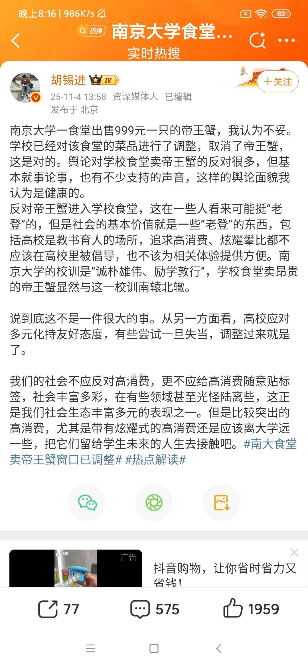 胡锡进:南京大学一食堂出售999元一只的帝王蟹,我认为不妥。学校已经对该食堂的菜品进行了调整,取消了帝王蟹! 胡锡进的说法也有一定的道理,支持胡锡进的人不在少数,同时也有网友表达了自己的看法。 其实这是一件非常好的事情,允许合理的范围讨论,学校食堂也觉得可能不妥,引发了较大的热议,所以把该道菜品给撤了。 各位是怎么看的?欢迎评论区留言。