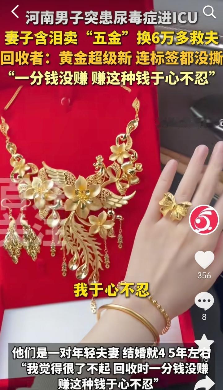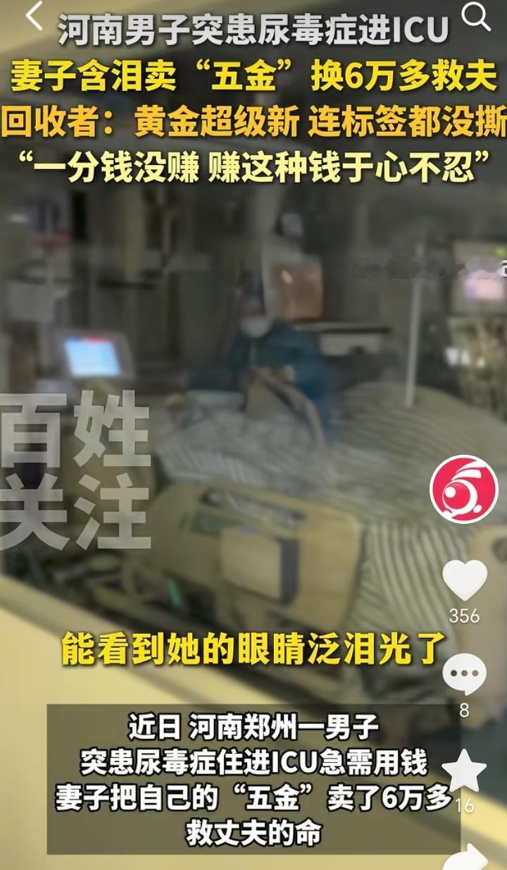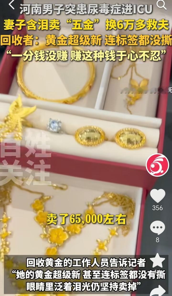 “娶妻如此夫复何求”!河南郑州,男子突患尿毒症住进ICU急需用钱,妻子含泪变卖首饰帮丈夫凑钱。 一对年轻夫妻原本生活美满,不料天有不测风云,丈夫突患尿毒症住进ICU急需用钱,这就让原本并不富裕的家庭雪上加霜,无奈之下妻子含泪卖掉了还未撕掉标签的金首饰,卖了65000元左右。 回收黄金工作人员觉得女子很了不起,当时还劝女子不着急卖,黄金可能还会涨,女子却说一分钟都等不了,工作人员回收时一分钱没赚,他觉得赚这种钱于心不忍。 女子的举动无疑是打破了“夫妻本是林中鸟,大难临头各自飞”的说法,丈夫得病女子并没有选择抛弃,而是含泪卖掉了金首饰凑钱,对于卖金首饰女子也是非常的不舍,但是老公的病情又不得不让她忍痛割爱,最终两者她还是毅然决然选择了救丈夫。 黄金回收工作人员也是非常的仁义,在他心里有一杆秤,知道那些钱能赚那些钱不能赚,这样的商家真是良心商家,不发财都难。 患难见真情,有这样的妻子男子一定要珍惜,等病好后一定要加倍补偿妻子。