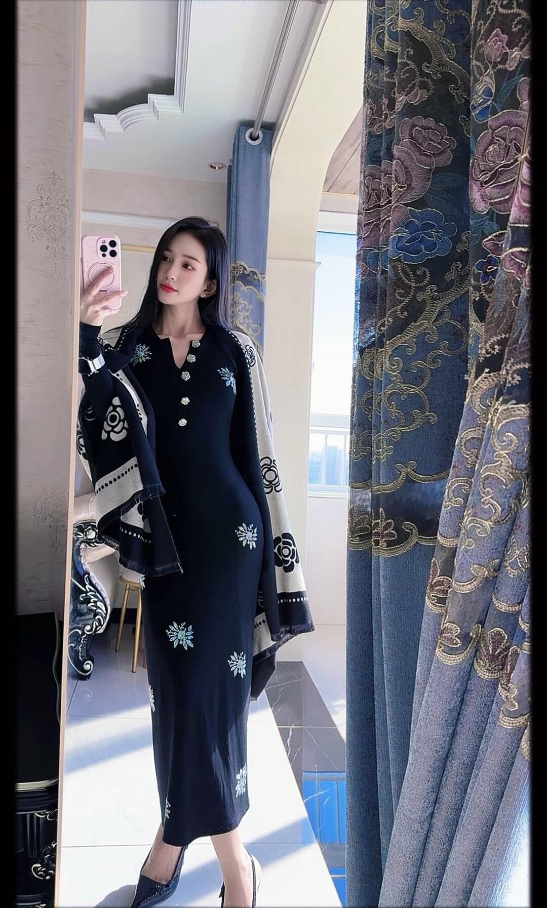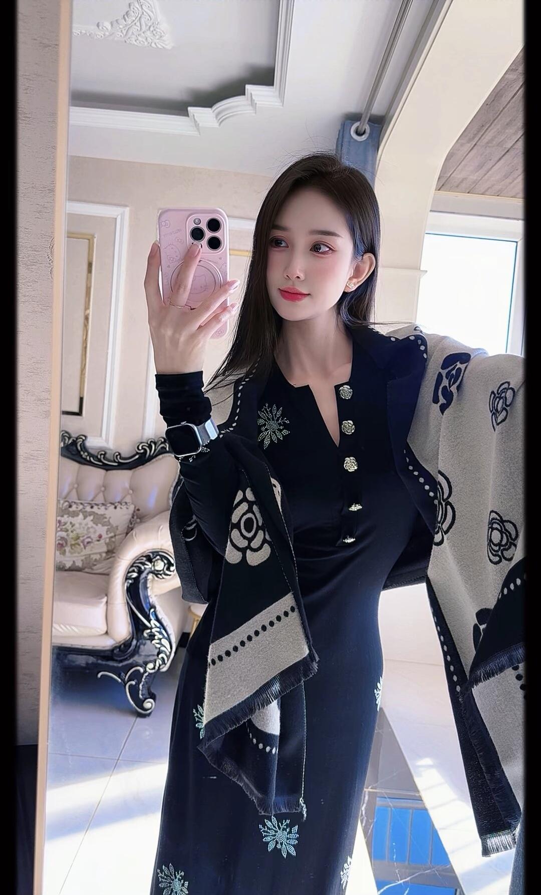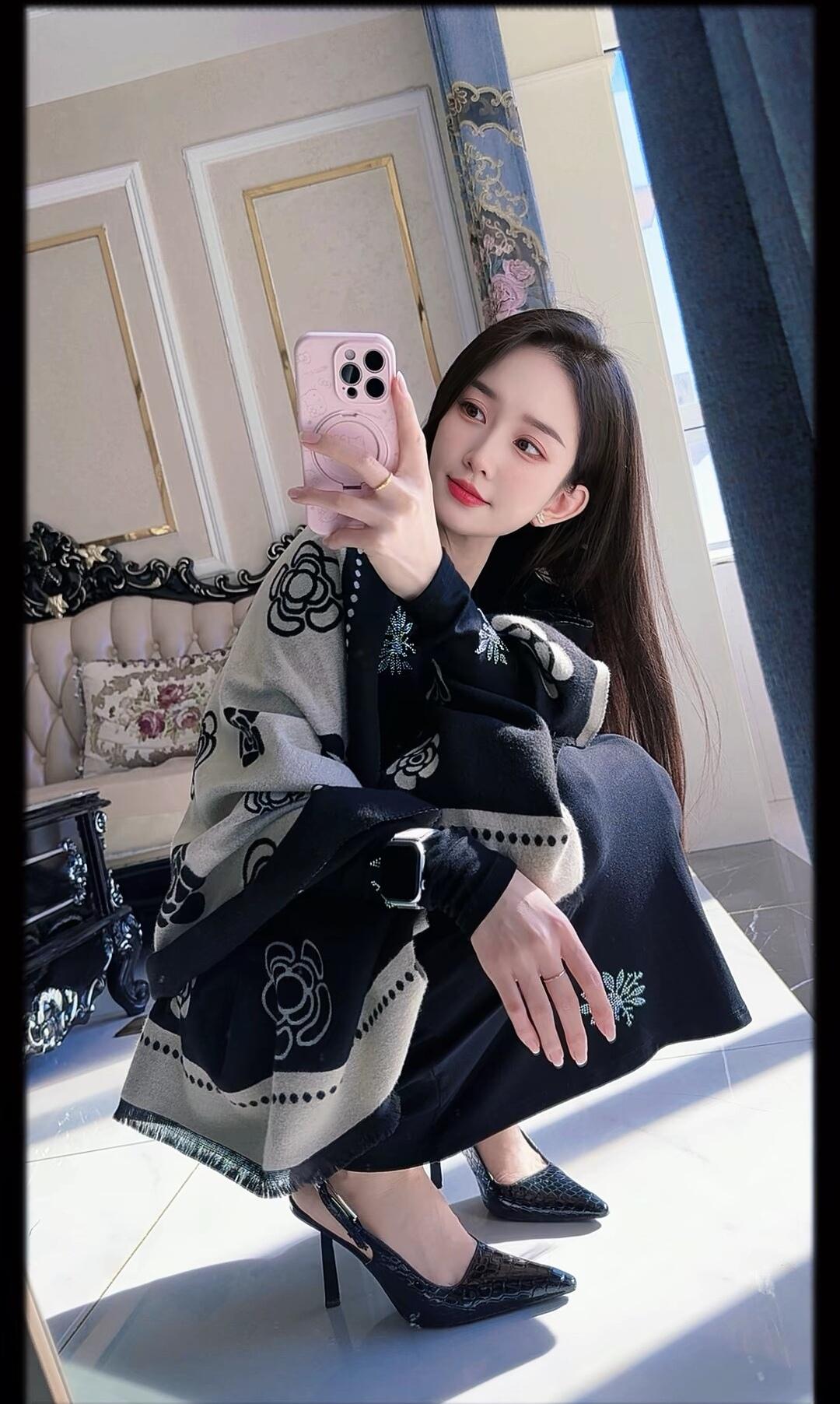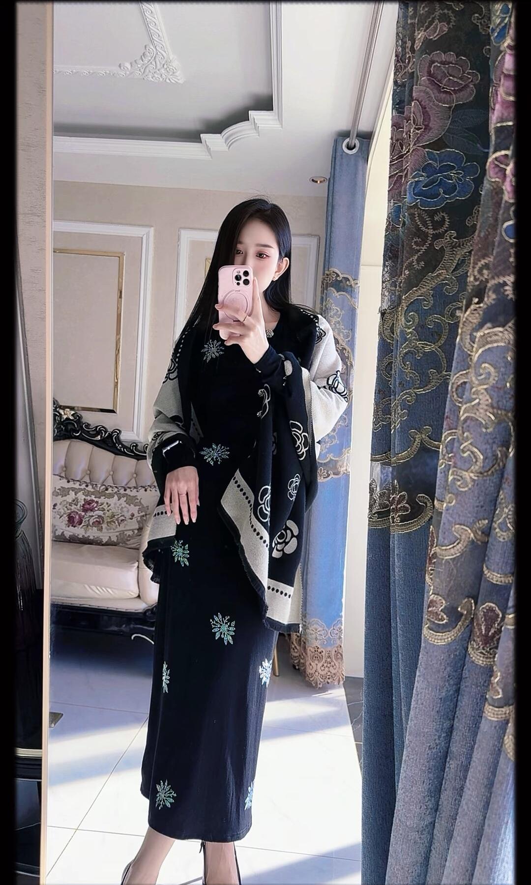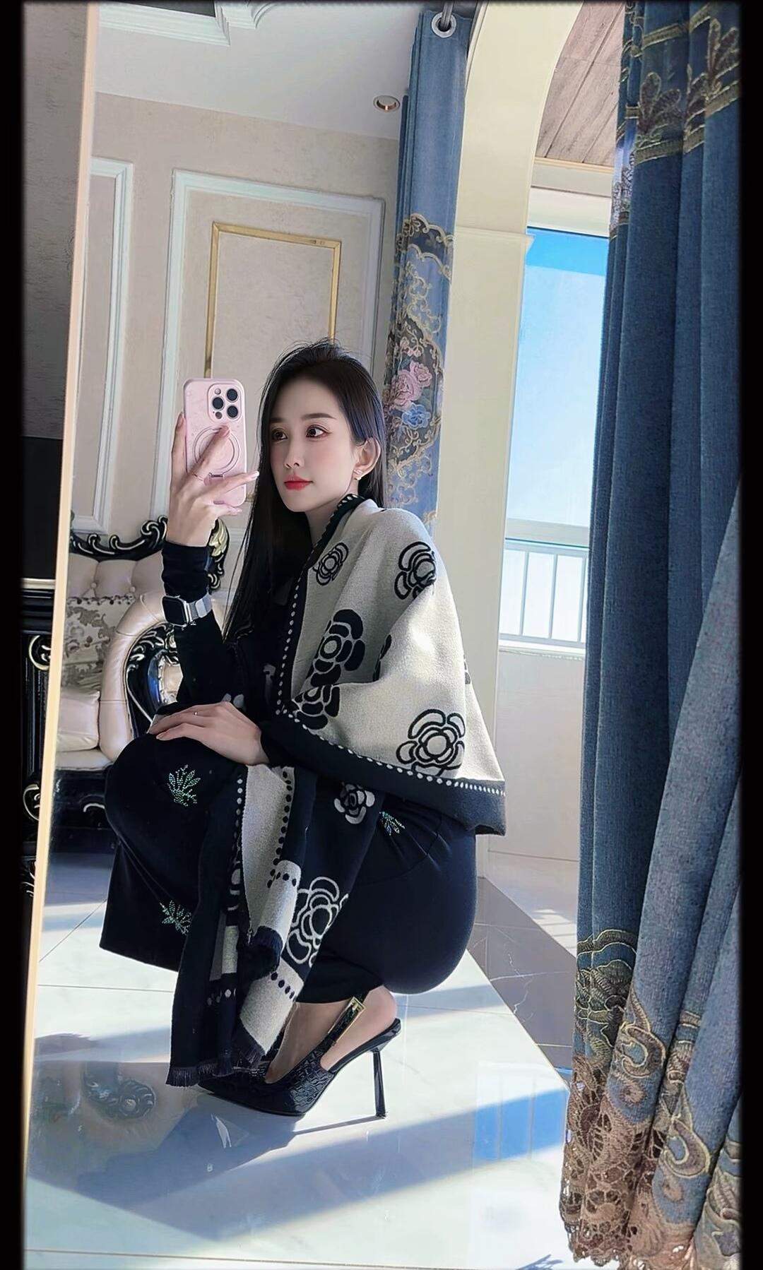 优雅黑裙搭配时尚毛毯,镜中自拍的完美瞬间