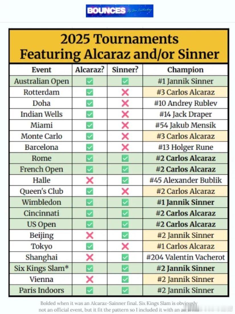 今年只要阿尔卡拉斯和辛纳一起参加同站比赛,冠军都会在这两人之中产生!