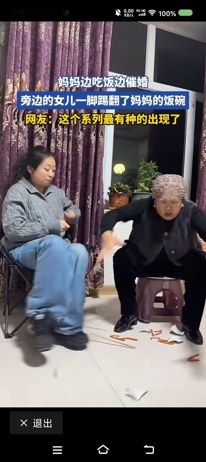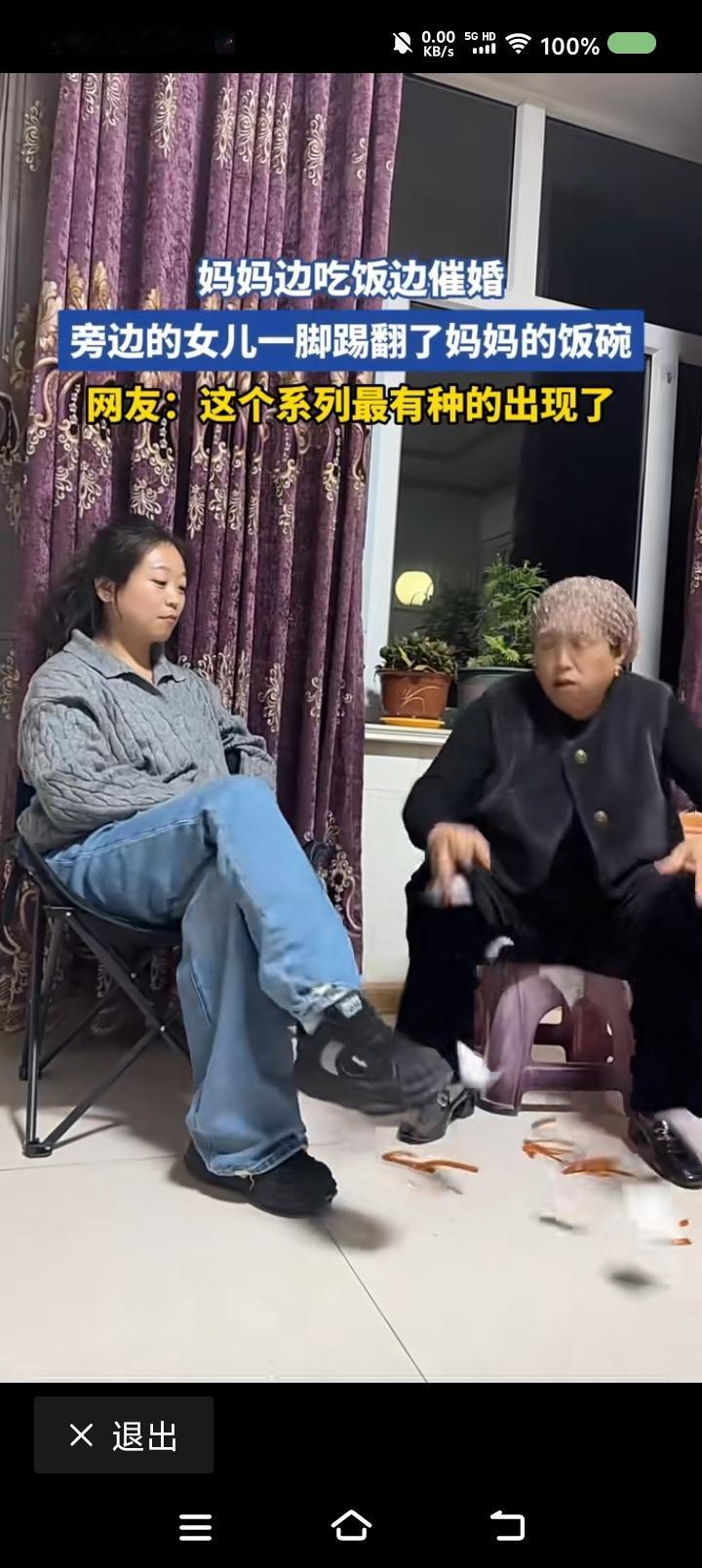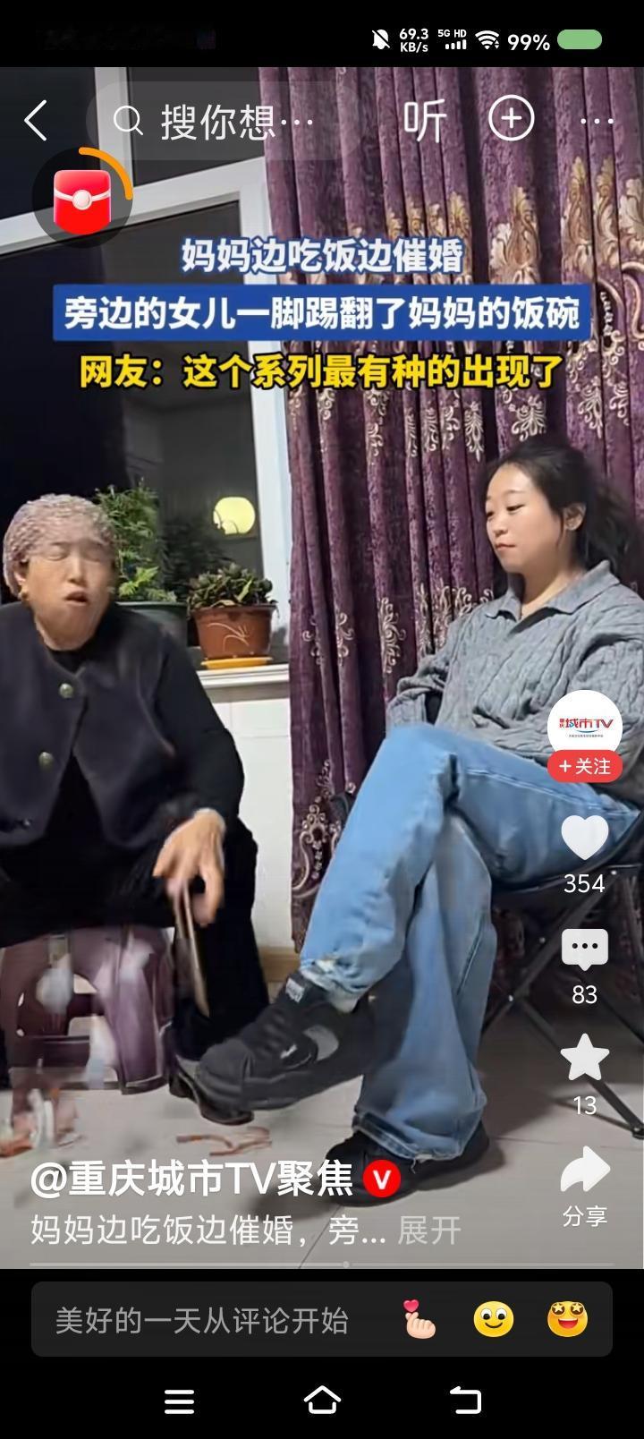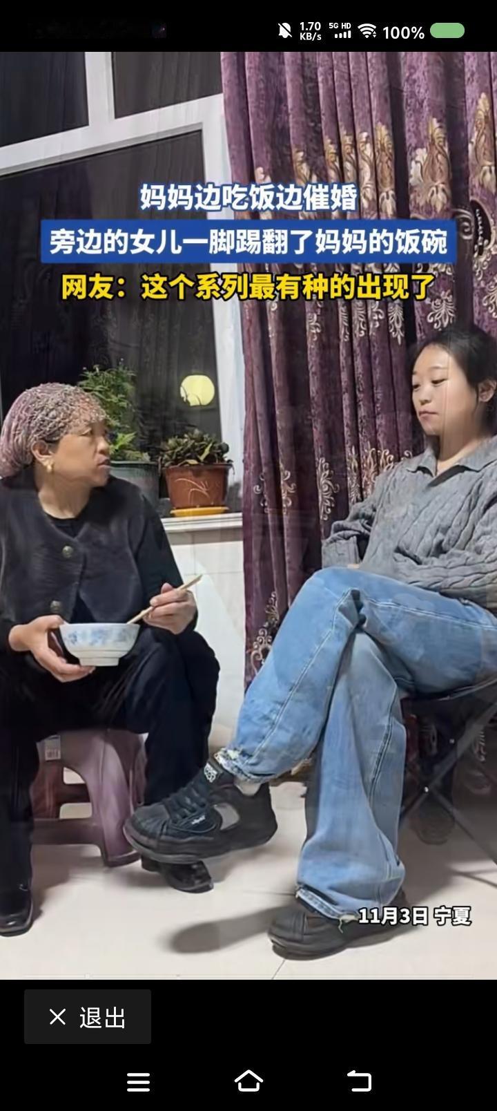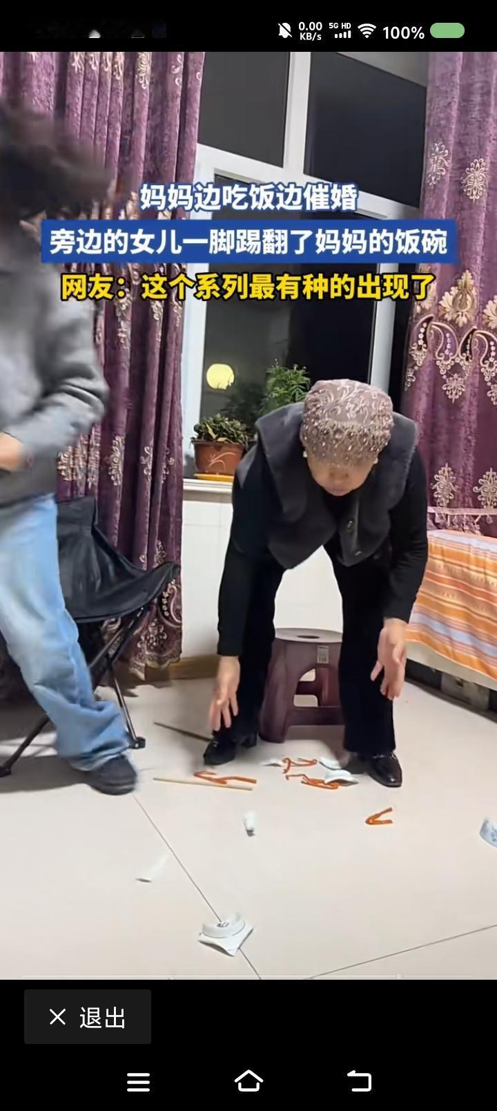 姑娘,说你什么好?—— 据报道,一女子与妈妈聊天,妈妈端碗吃饭。女子嫌妈妈催婚,上脚磕翻妈妈的碗,跑了。 点评: 一、宁愿相信这是电视剧。 生活中,如果我是女子的妈妈,怎么办?关门! 二、希望女子公开道歉。 三、呼吁网友不要因此网暴当事人,否则,不但于事无补,还涉嫌违法违规。
