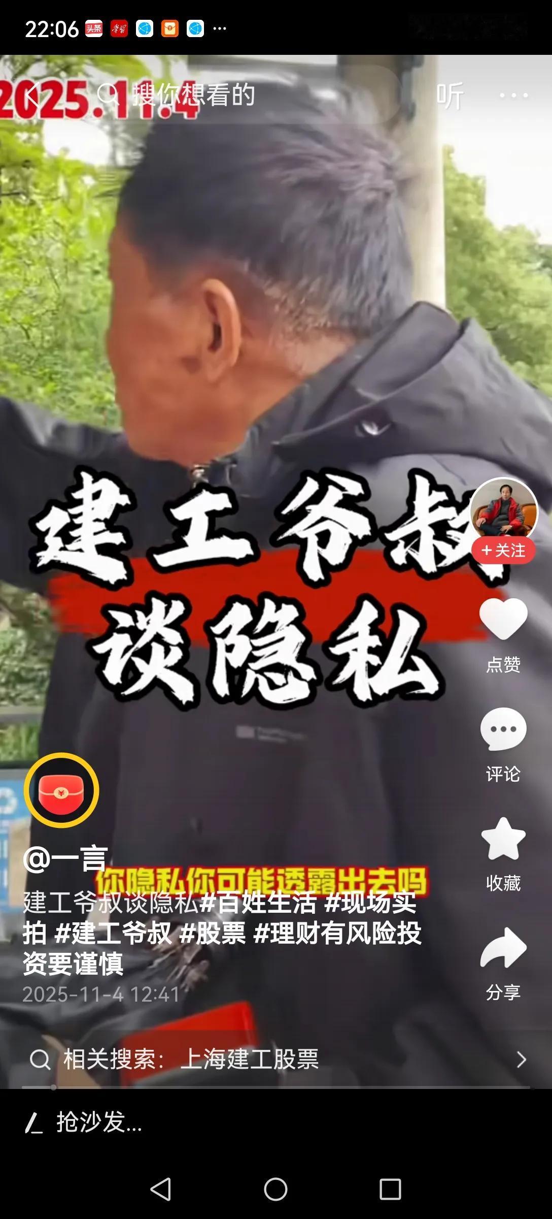 建工爷叔真好玩,为了成网红几乎把自己所有事都说出来了。比如、自己的初恋,怎么去的新疆,怎么回上海擦玻璃,怎么买的认购证等等。但当有人问他有多少上海建工时,他反而怒目以对说是隐私了!真让人怀疑他是真买了上海建工呢?还是在作秀呢?