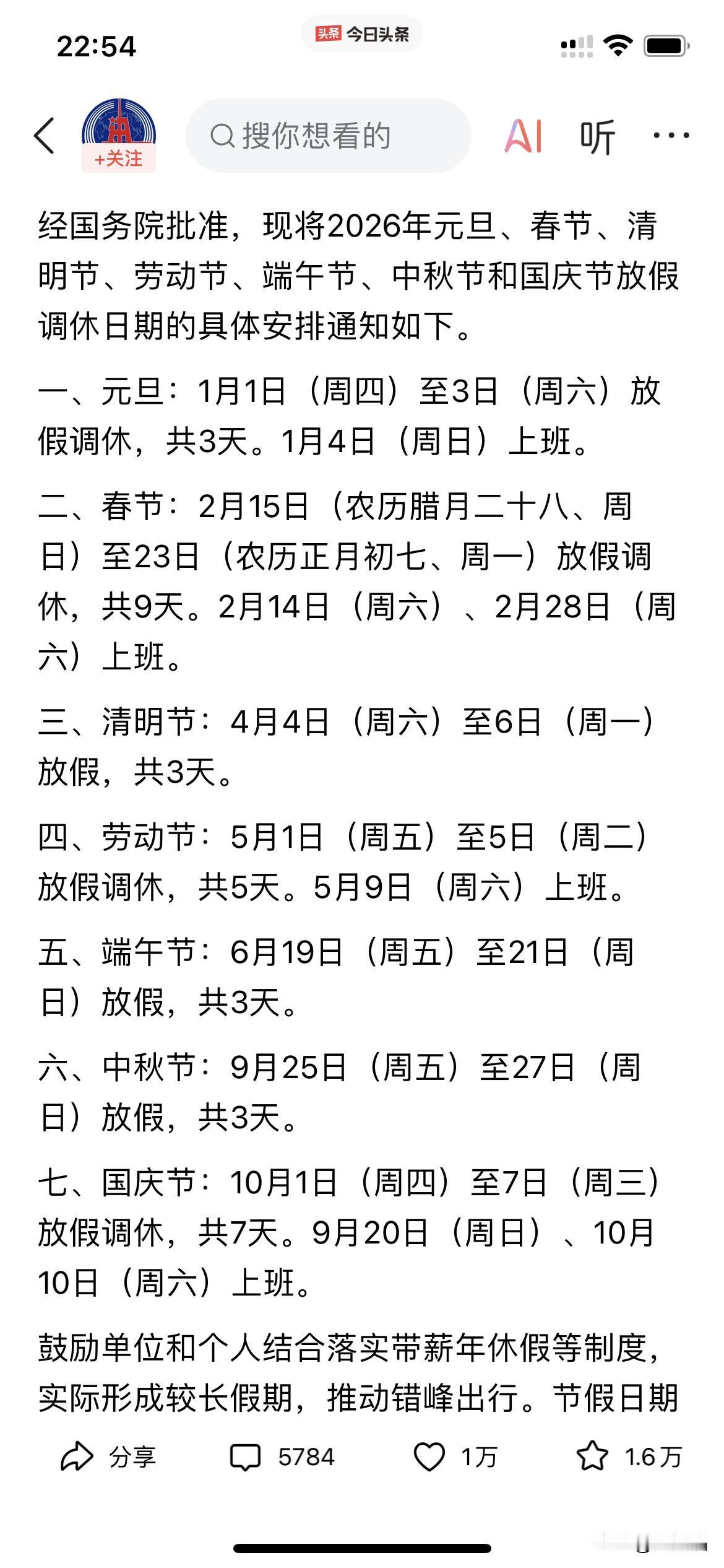 史上最长春节假期连休9天!终于年廿八开始放法定假期了,不用上到年三十了。 家人们,谁懂不用上班上到年三十的感觉?请不到假,抢春运票都难抢,年三十赶上末班车回家,初一才到家,真的连卫生都没时间搞。 不得不说,2026年的节假日安排还挺好,端午节和中秋节和周末连在一起,有三天小长假。最重要的是,中秋节终于没和国庆节重叠了,休三上三,再休7天简直不要太爽。
