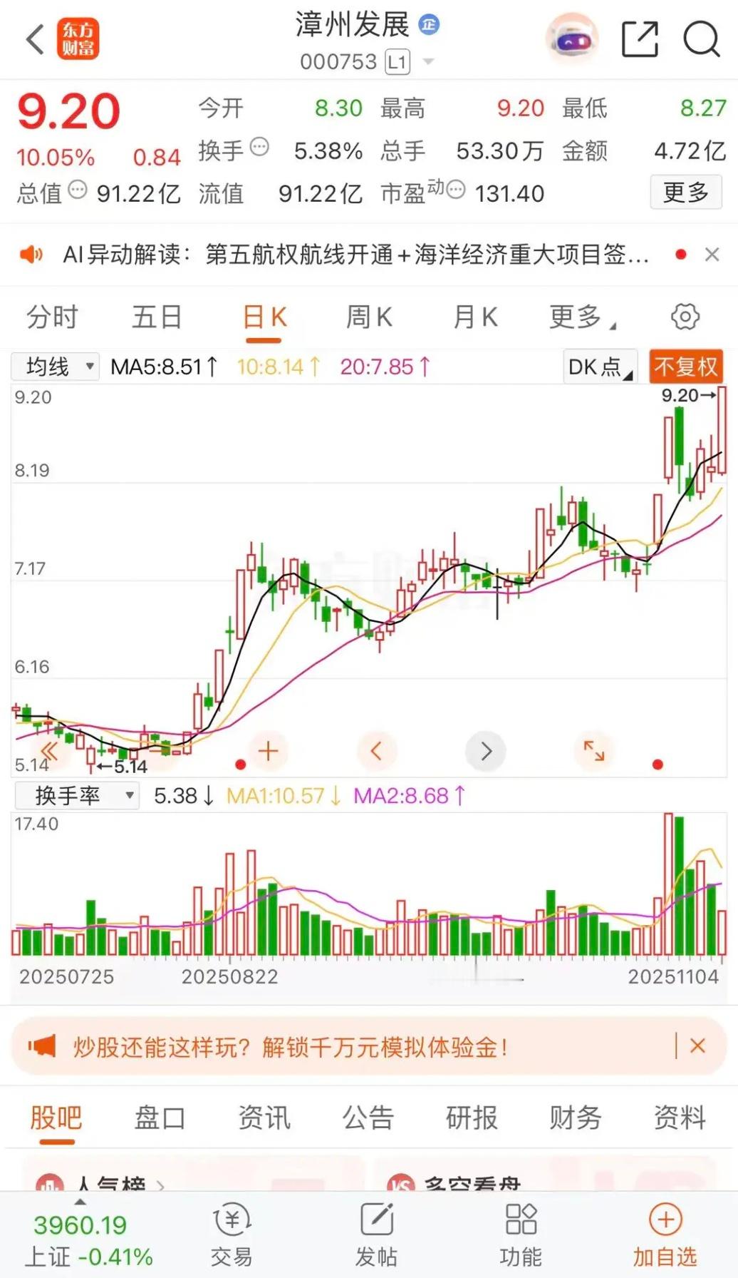 漳州发展涨停板收盘报收9.20元每股。成交金额4.72亿元,有望突破15年高点13元每股。
