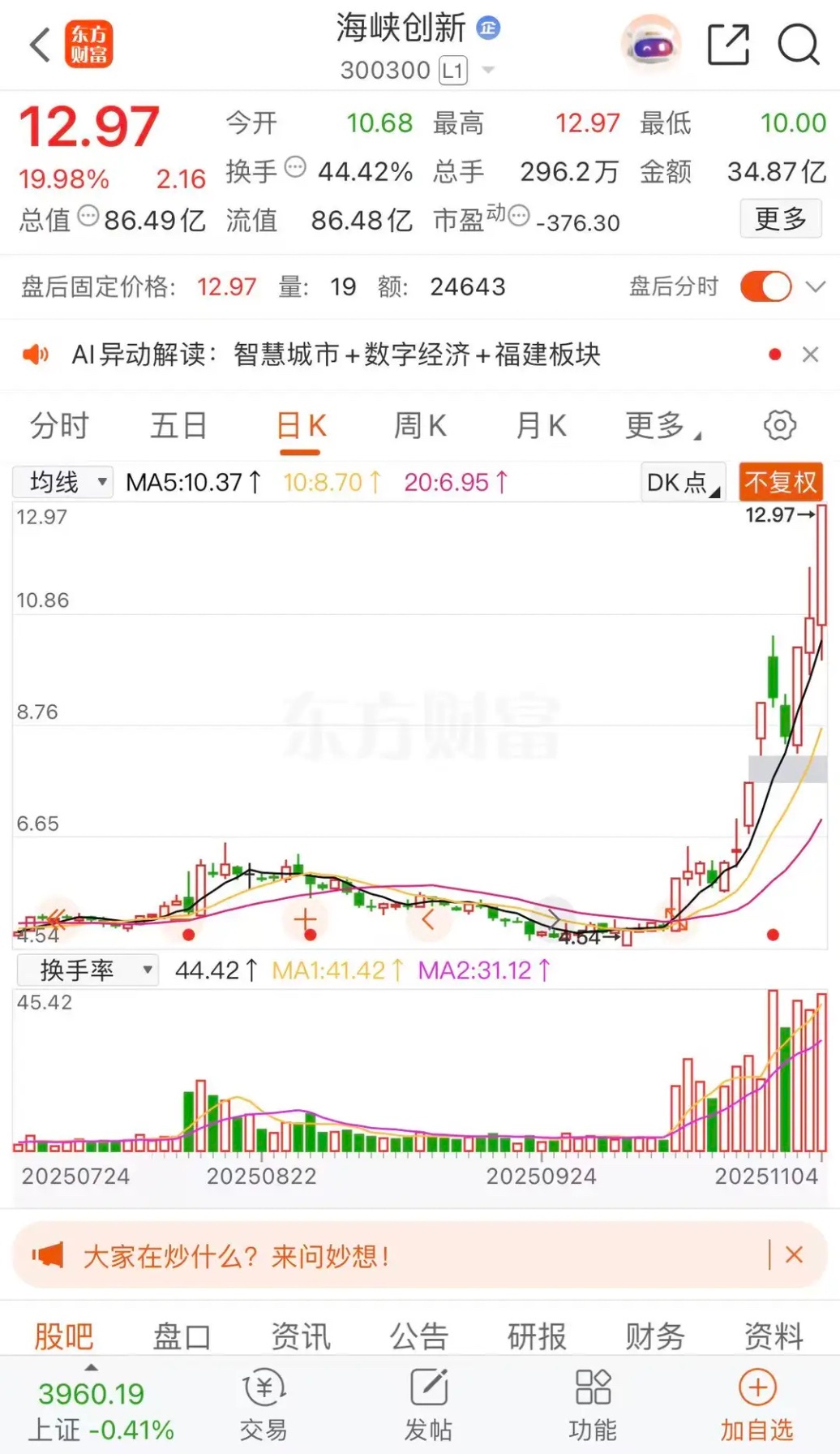 海峡创新涨停板收盘报收12.97元每股,成交金额24.87亿元,24年最低价0.96元每股,差点退市。强强强