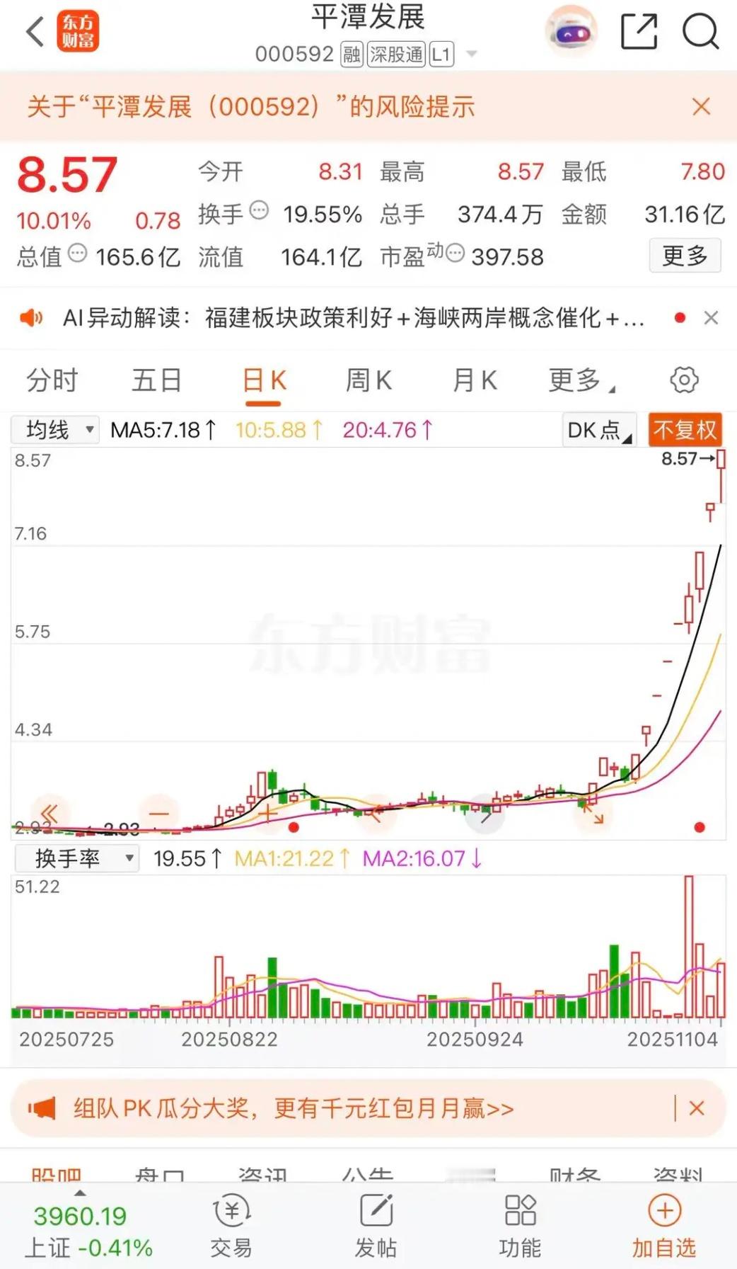 平潭发展涨停板收盘报收8.57元每股,成交金额31.16亿元。达到13天10个涨停板,能不能冲到10元每股,拭目以待。
