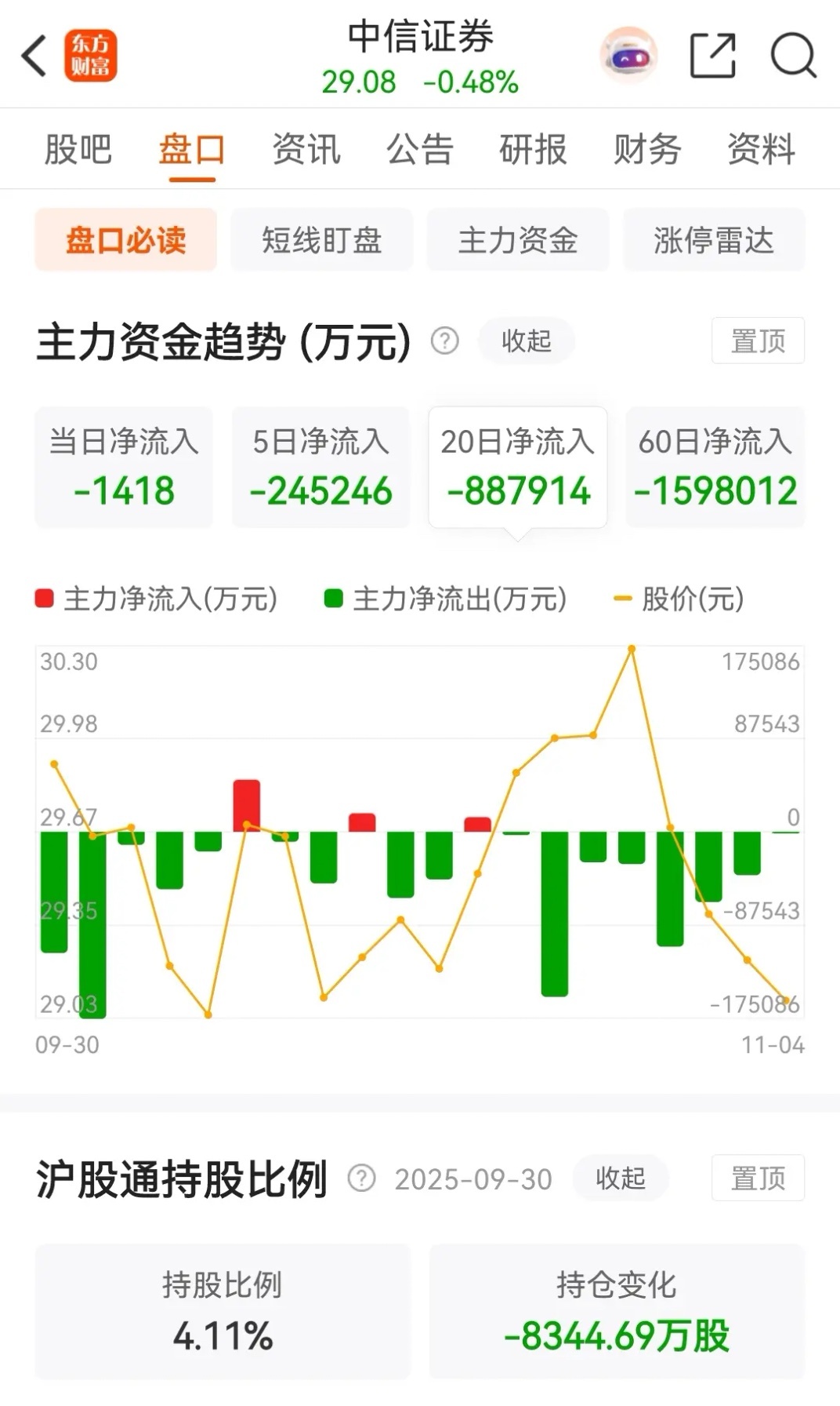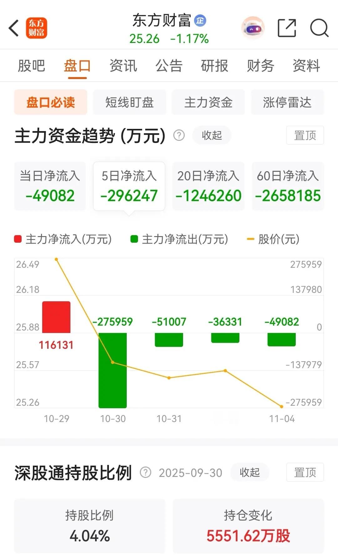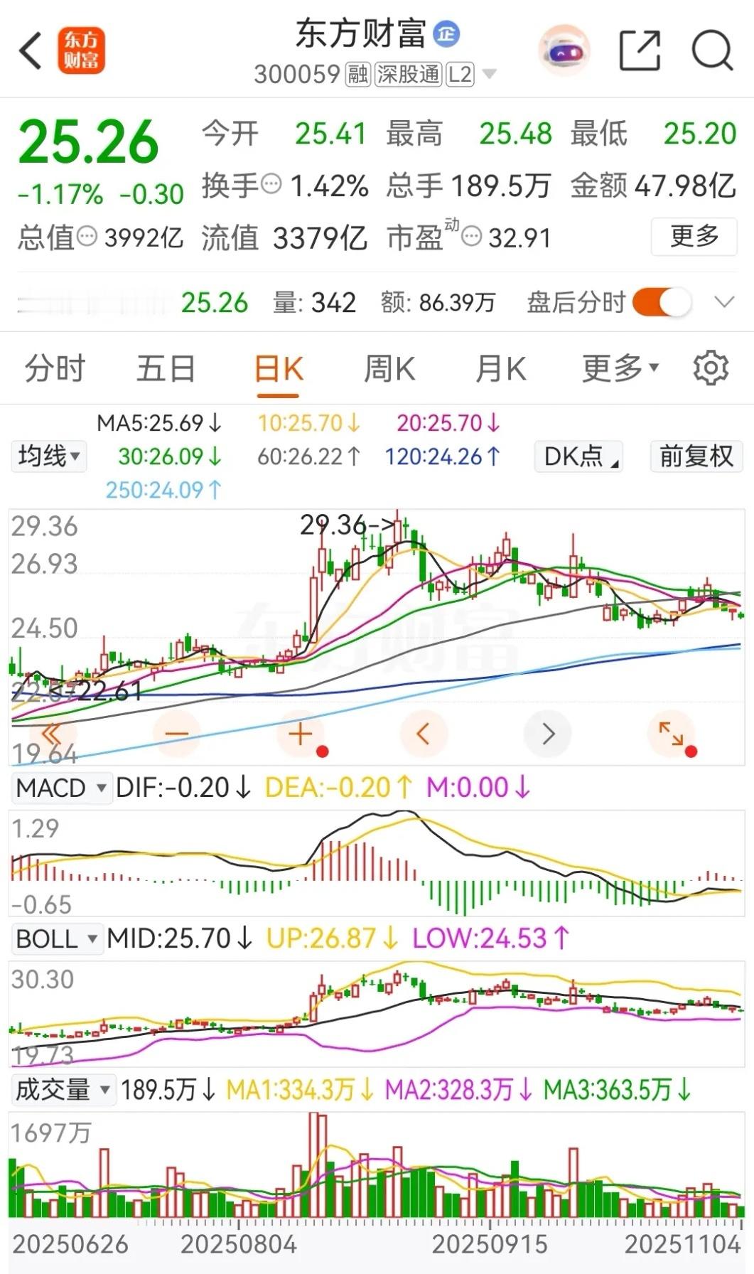 东方财富连续四天被主力净卖出,今天小幅下跌了 1.17%,而券商一哥中信证券则是连跌四天,且更是连续八天被主力资金抛售。东方财富今天低开后缩量震荡整理,收盘时跌了 1.17%,收盘报价为25.26元,全天的成交金额为47.98亿元。在资金流向上,今天被主力资金净卖出了4.9082亿元,目前已是连续四天被主力资金净卖出了,近五个交易日得合计净卖出金额为 29.6247亿元。从走势上看,今天在低位收出了一颗缩量小星线,虽然走势上破位,但是盘中最低价也未曾跌破昨日的最低价,明天有望反弹!