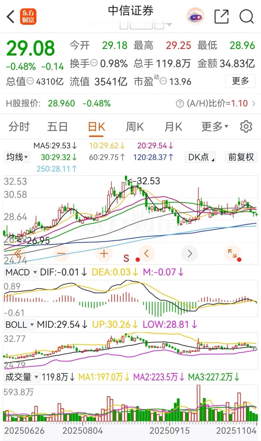中信证券今天同样也是低开后整理,下跌了0.48%,收盘报价为29.08元。在资金流向上,虽然目前已是连续八天被主力资金抛售,但是今天的净卖出金额却较小,仅有0.1418亿元,近五个交易日则是合计净卖出了 24.5246亿元。从走势上看,虽然破位,但是盘中的低点同样也未曾跌穿昨天的低点,结合主力资金的流出情况,明天反弹有望了!至于更详细的技术分析,可以查看上一篇中关于券商概念板块的分析。