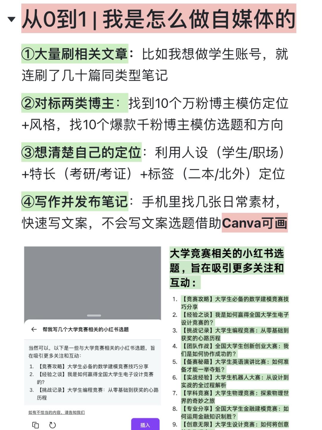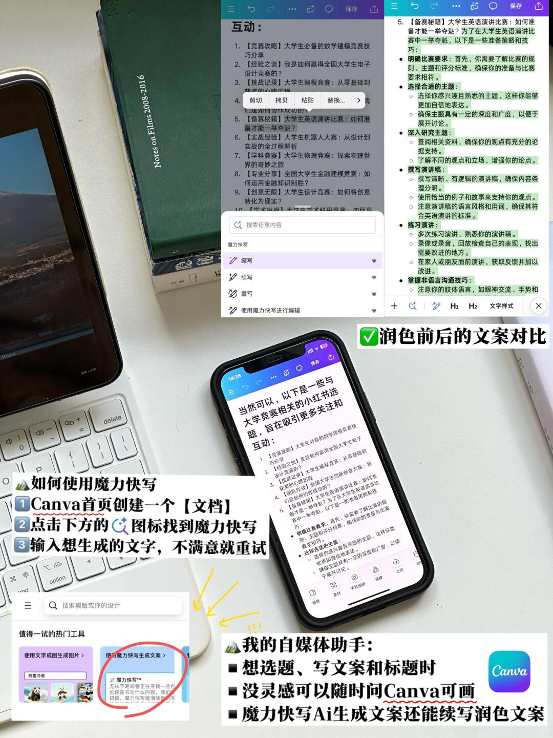 建立建立常规、热点、系列选题,结合热点借助Canva作为工具,方法是创建一个文档打开魔力快写,输需求,比如“写几个大学竞赛相关的选题”,Ai快速生成选题,也可生成文案、标题、笔记续写和改写🏝️
