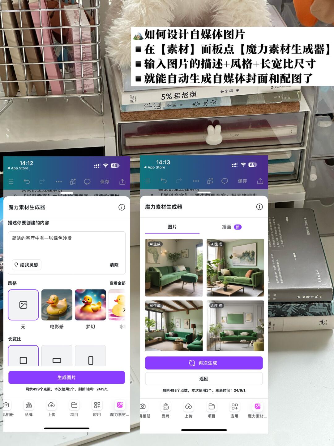 不用自己画,Canva快速生成13种插画设计风格插画素材,在【素材】面板,找到【AI图片生成器】,点【生成自己的内容】,输入文字描述,选图片风格和长宽比就能生成封面和配图,省去p图时间,色调不喜欢还可智能配色🌦️
