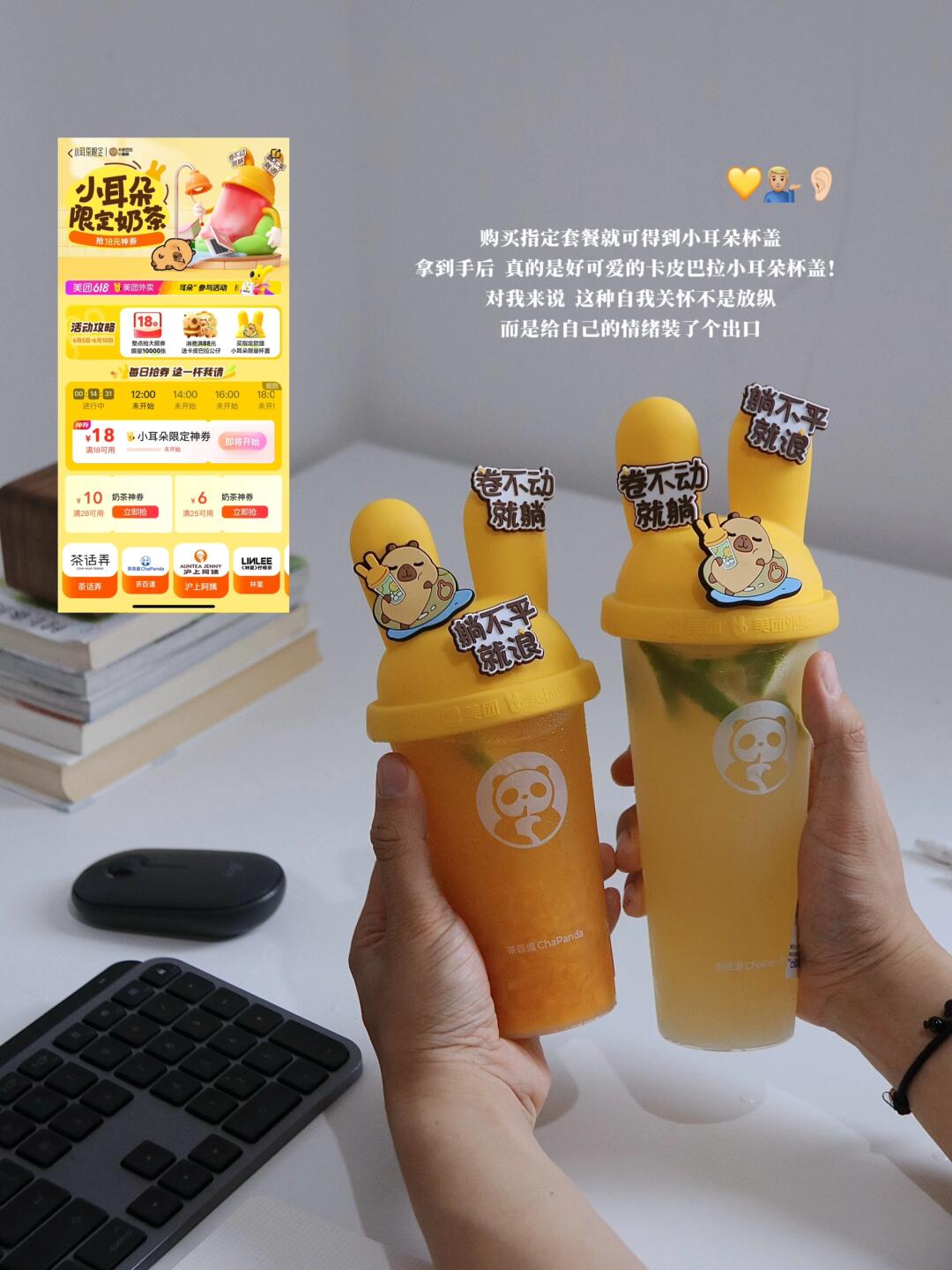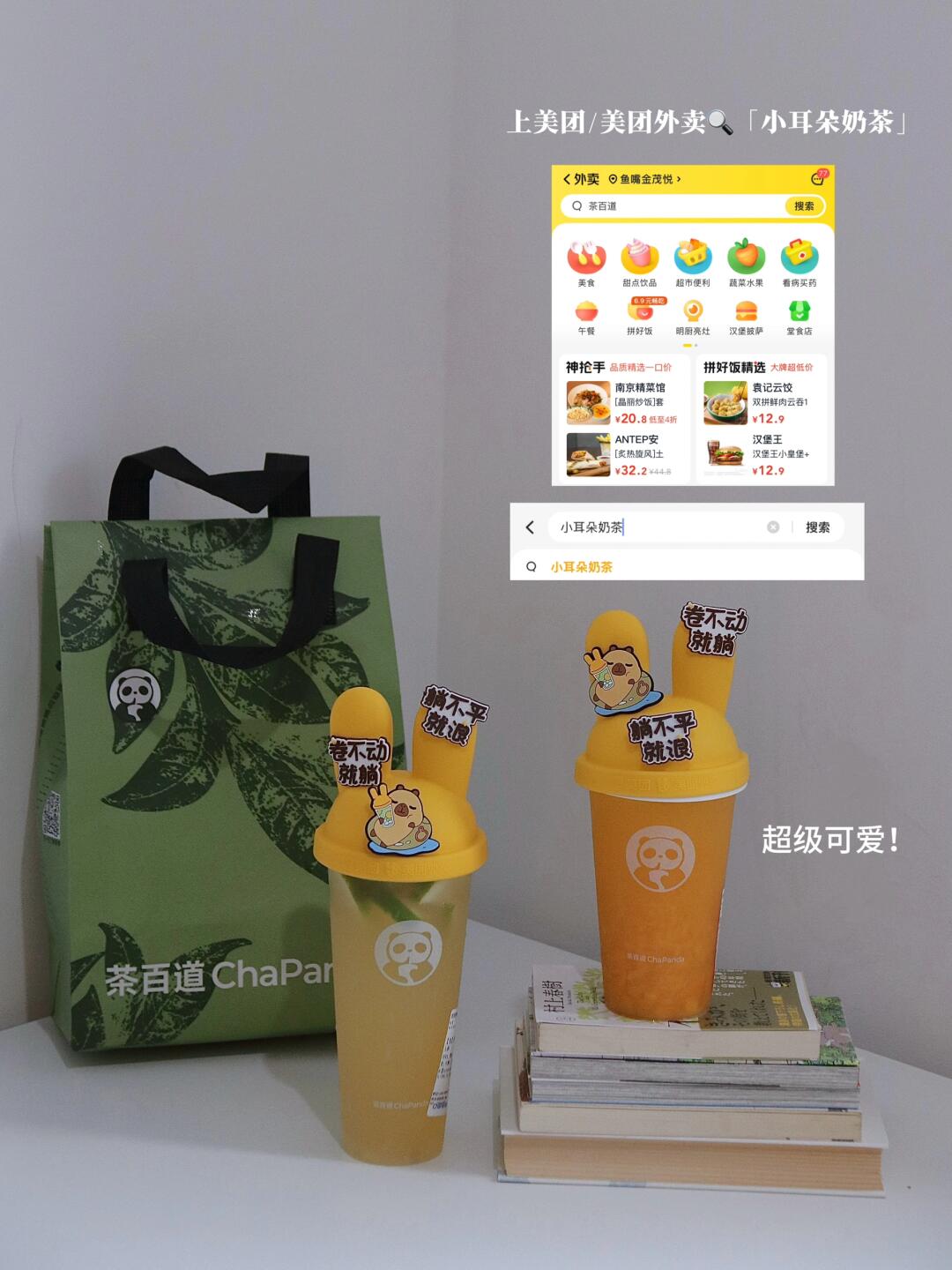 比如我经常喝茶百道,最近在美团外卖搜「小耳朵奶茶」买茶百道西瓜啵啵,拿到卡皮巴拉小耳朵杯盖的瞬间,焦虑感真的会被治愈。这种自我关怀不是放纵,而是给自己的情绪装了个出口