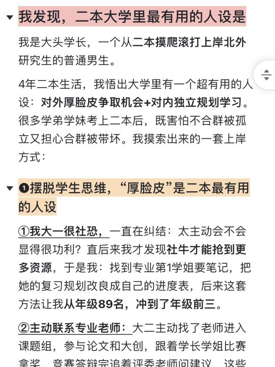 ①我大一很社恐,一直在纠结:太主动会不会显得很功利?直到后来我才发现社牛才能抢到更多资源,于是我:找到专业第1学姐要笔记,把她的复习规划改良成自己的进度表,后来这套方法让我从年级89名,冲到了专业前三。