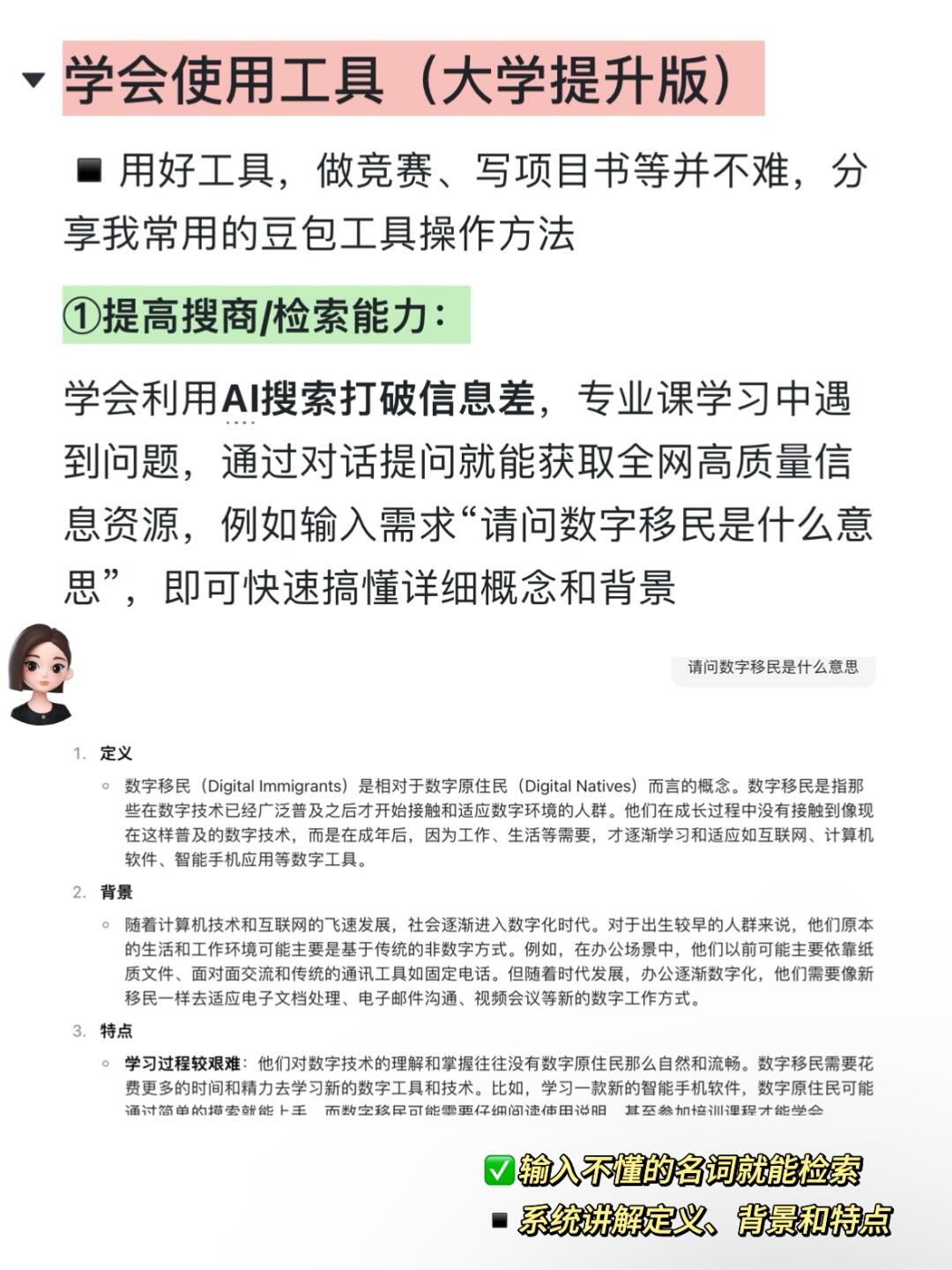 用AI搜索打破信息差,专业课遇到问题对话提问就能获取全网高质量信息,例如输入需求“数字移民是啥意思”,快速搞懂概念和背景,备考遇难题拍照就能搜题