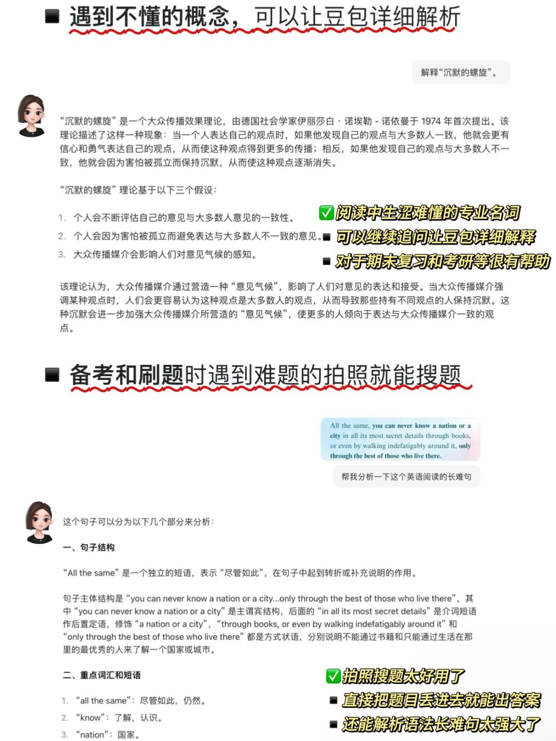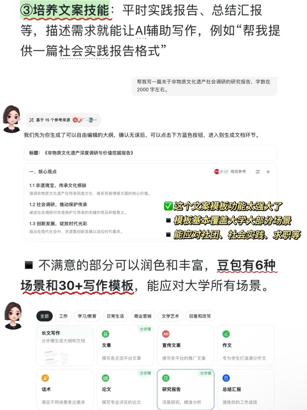 实践报告、总结汇报等,可让AI辅助写作,例如“提供社会实践报告格式”,不满意的可润色,例如“帮我丰富项目背景”,豆包有6种场景和30+写作模板,应对大学所有场景