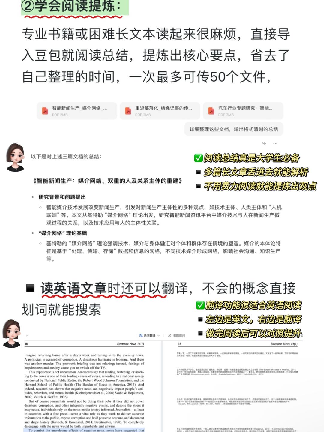 专业书或长文本,导入豆包就能阅读总结,提炼核心要点,省去整理时间,一次最多传50个文件,不懂的划词就能搜索,做英语阅读时还可翻译