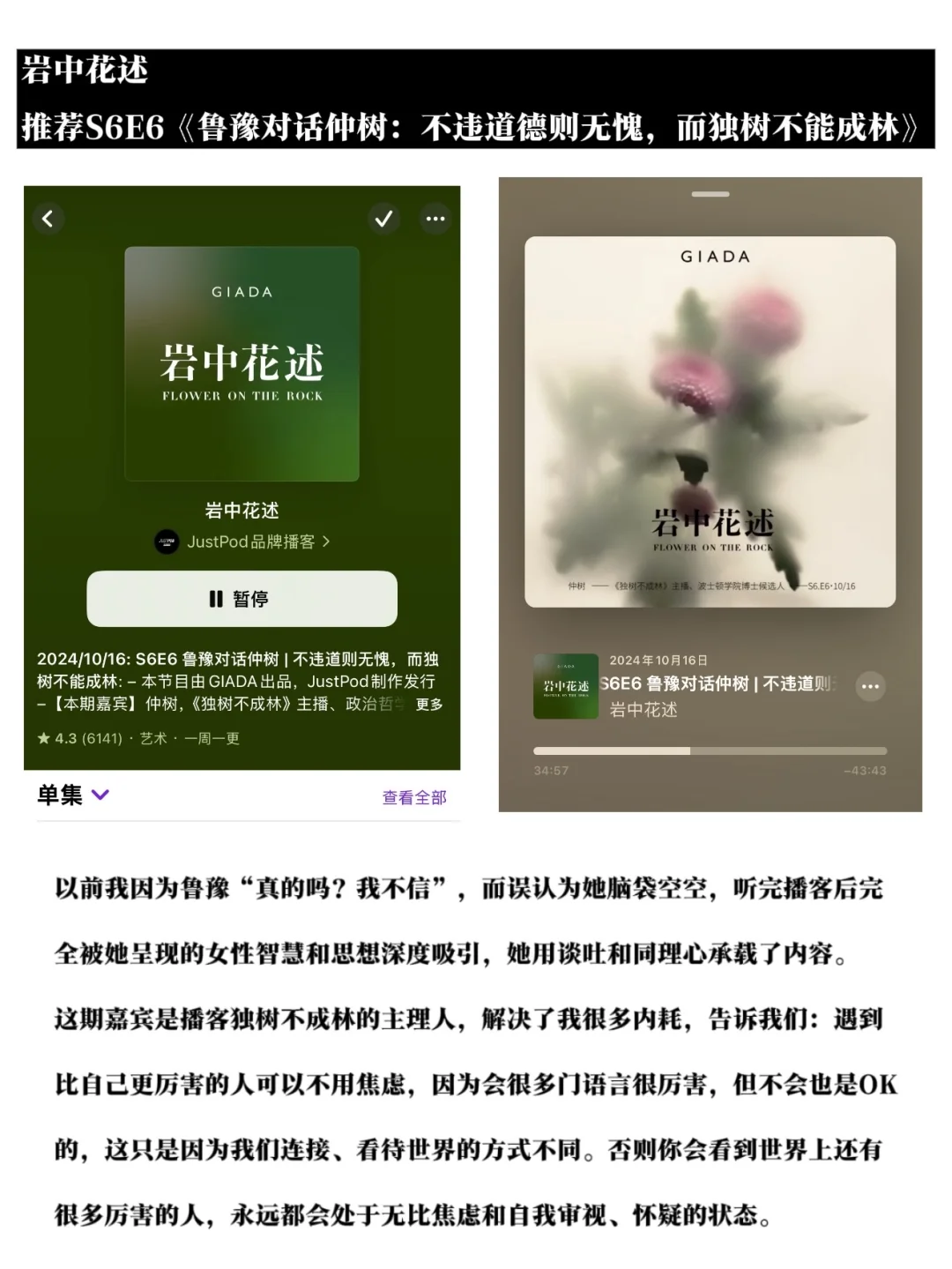 ▪️以前因为鲁豫“真的吗?我不信”,而误认为她脑袋空空,听播客后被她呈现的女性智慧和思想深度吸引,她用同理心承载了内容。这期解决了我的内耗:遇到比自己更厉害的人可以不用焦虑,因为这只是因为我们连接、看待世界的方式不同。