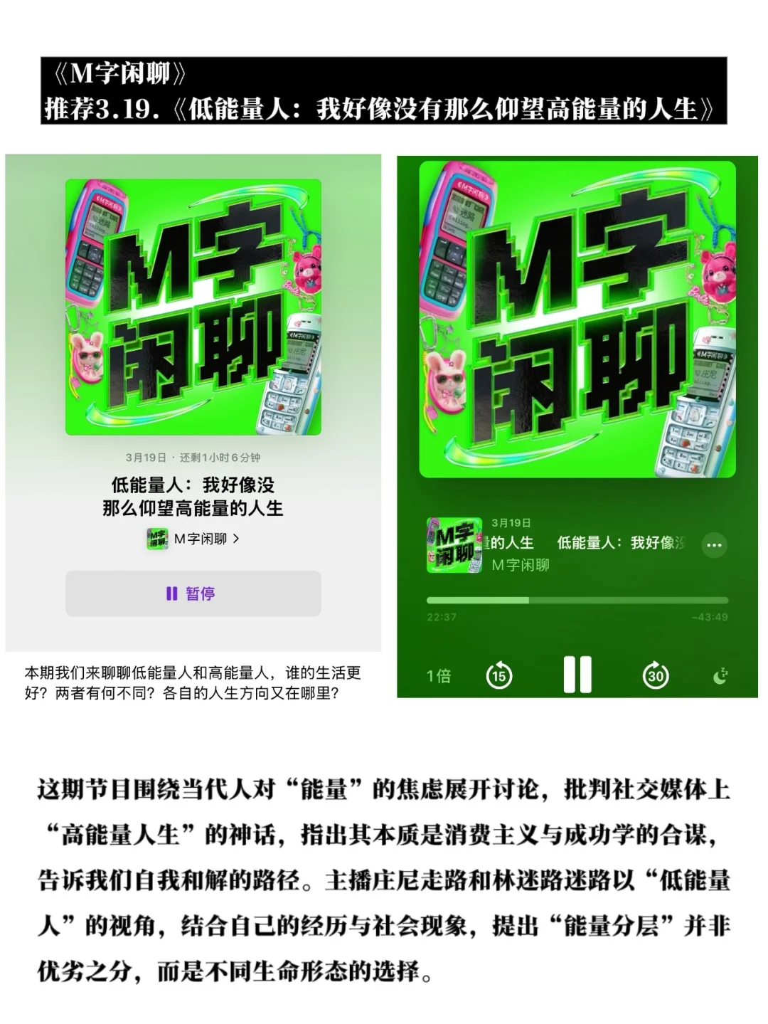 ▪️这期节目围绕当代人对“能量”的焦虑展开讨论,批判社交媒体上“高能量人生”的神话,指出其本质是消费主义与成功学的合谋,告诉我们自我和解的路径