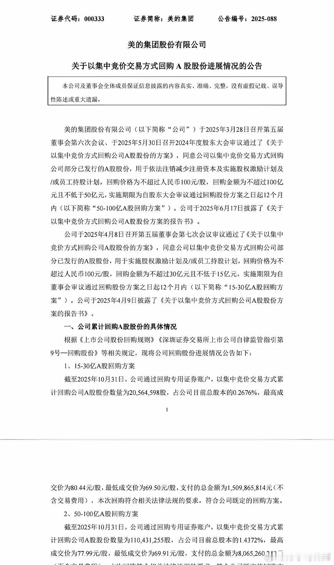 2025年4月8日,美的集团再次发布回购方案,拟回购A股15亿元至30亿元。