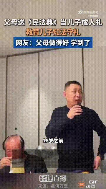 陕西渭南一个男孩过18岁生日,父母为他在饭店举办了成人礼,并邀请了亲朋好友一同见证,在吃完饭后,妈妈送给了男孩一块手表,而爸爸送给了男孩一本《民法典》,对此爸爸表示,你18岁之前,爸爸站在你前面,你18岁之后,爸爸站在你身后,希望你以道德为高线,以法律为底线,做一个遵纪守法对社会有用的人,网友看完这段视频,都觉得这位爸爸做得太好了,身为父亲,他在孩子18岁之前,为孩子遮风挡雨,已经付出了很多,而孩子18岁之后,应当让孩子去拼搏属于自己的人生,但他依然会站在孩子身后默默支持,而他唯一的要求,就是希望孩子能够遵纪守法,相信这对男孩来说,是非常有意义的,可见这位爸爸实在是用心良苦啊。大家怎么看呢?