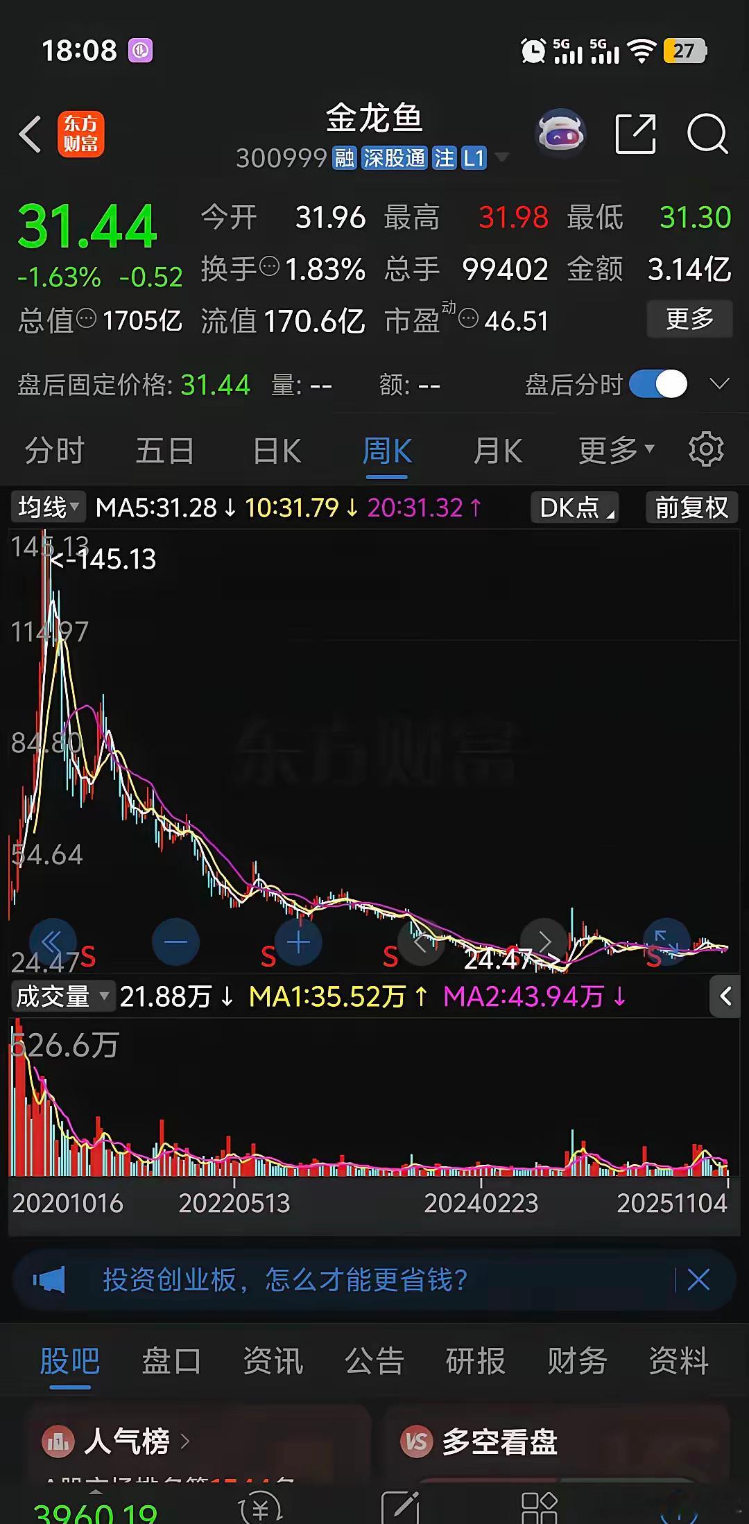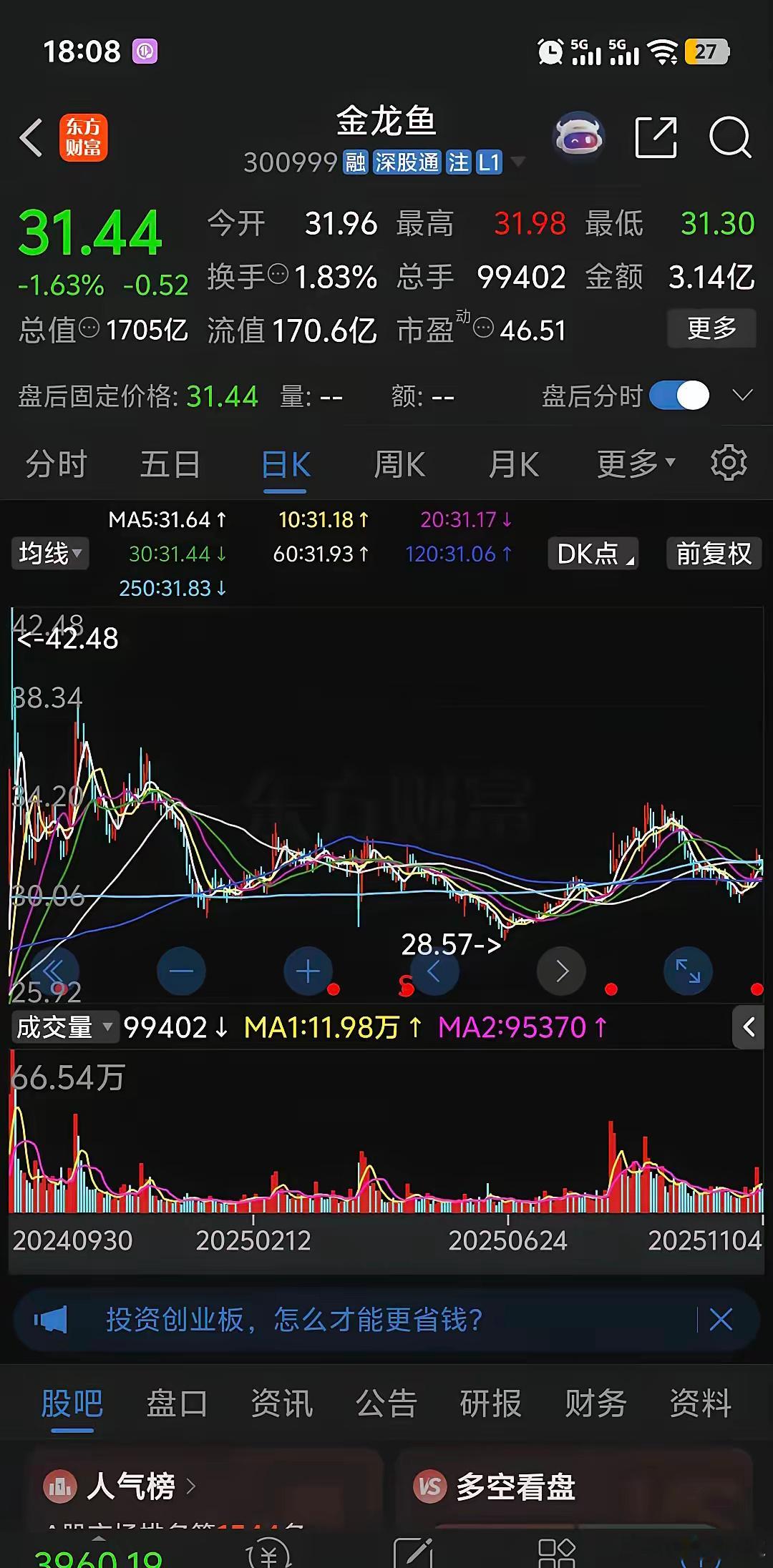 金龙鱼在本轮牛市行情中最吃亏,7,8两个月上涨,9,10两个月下跌,今天随着大盘调整也下跌了1.63%,股价无法摆脱半年线和年线,大盘都上过4000点创10年新高,金龙鱼仍然在31附近震荡,离去年10月高点还有30%的空间,感觉非常难,这波牛市分化严重了,前几年的白马股很多都涨不上去金龙鱼更是如此,离历史最高价145有非常大的距离,现在两市两万多亿的成交额金龙鱼能分到的仅不到10亿,前几年追高的股民如果不操作即使牛市解套仍然非常困难,惨不忍睹。