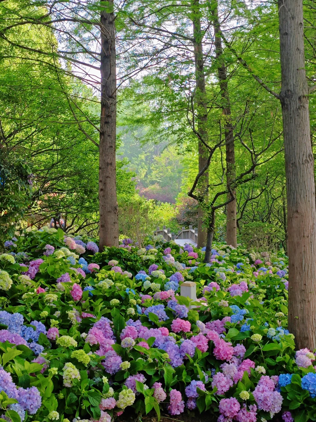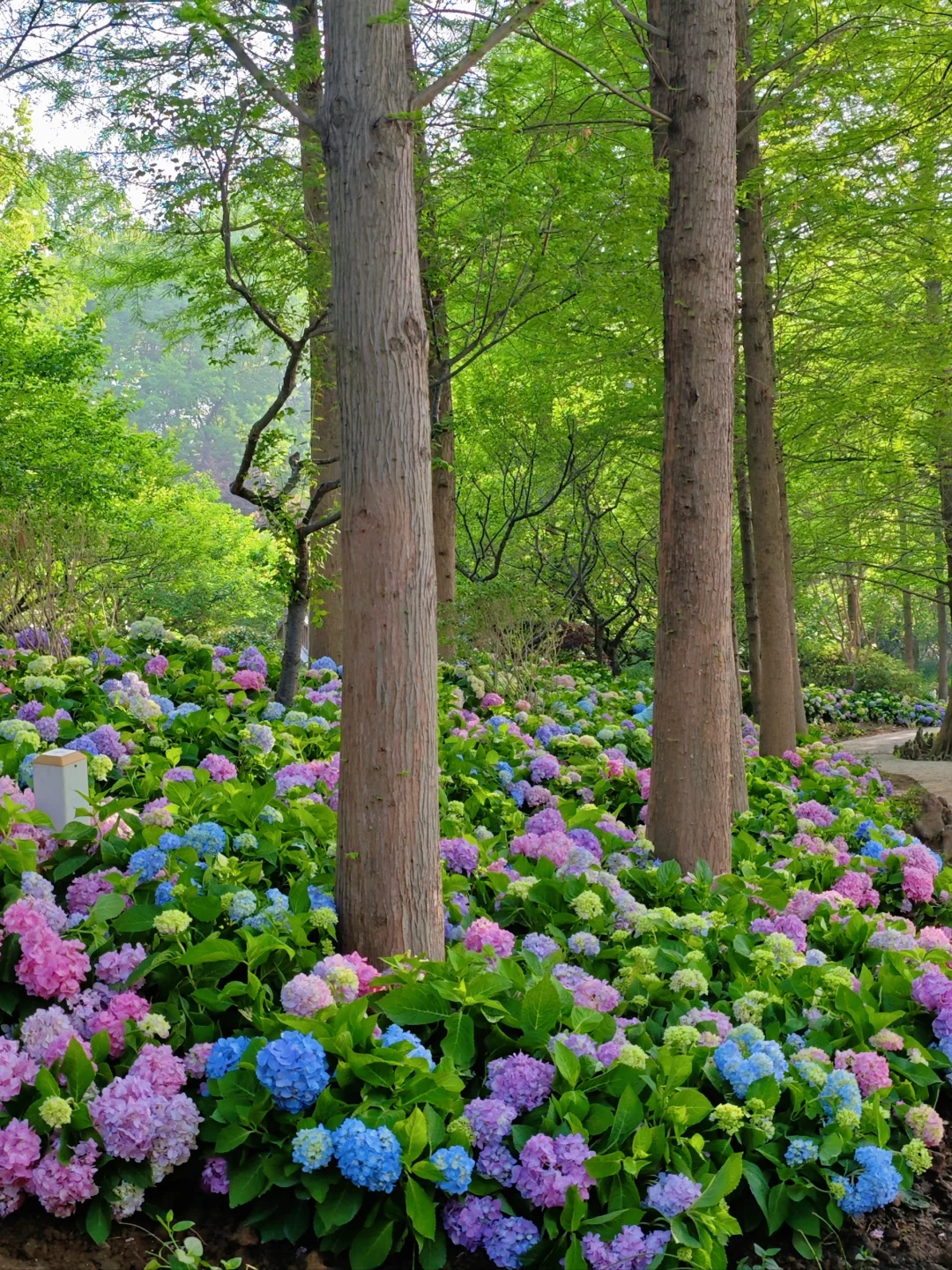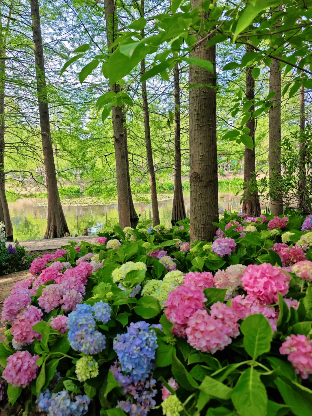 Hello大家,我是爱旅行爱拍照的- 太卷了,太卷了!花期本该5月的绣球无尽夏提前上线了! 中山植物园的绣球还没有动静,明孝陵燕雀湖旁的无尽夏已花开成海 每年春天都会来这里拍落羽杉仙境,这是第一次在燕雀湖旁看到绣球花海 燕雀湖的落羽杉也绿了,清晨的阳光洒落下来,真的美成了莫奈花园 - 📍南京明孝陵景区燕雀湖3号门,绣球花具体位置在3号门进去右手边 -