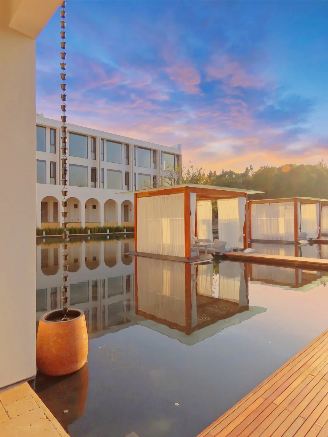 一楼走廊和楼顶的泳池都是出片机位,夕阳西下的时候光影绝了