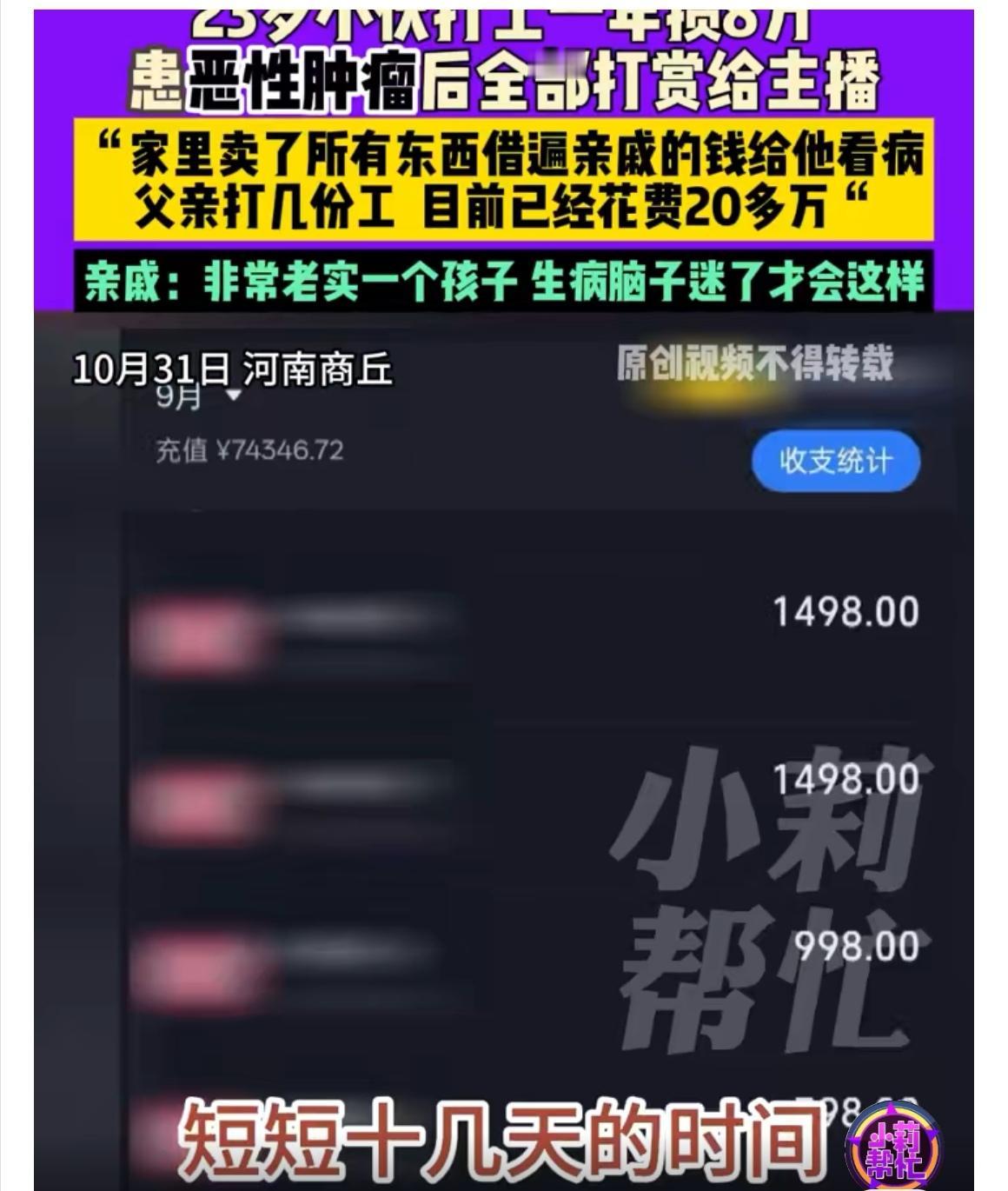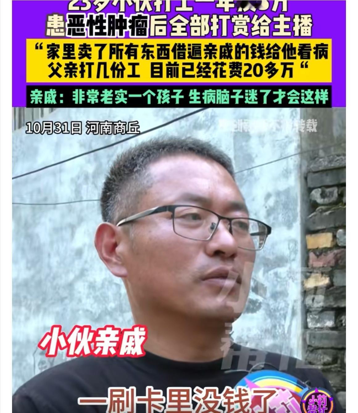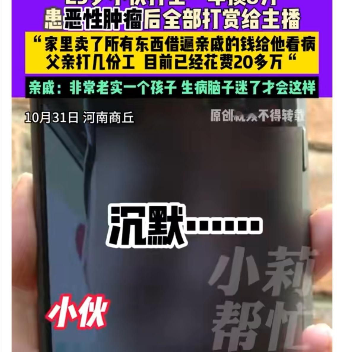 【热点关注】小伙抗癌钱全打赏主播,8万积蓄一夜蒸发,家人泪问“还能要回来吗?” 你能想象吗?河南商丘一位23岁的小程,原本打工一年攒下了8万块钱,本来是留着救命化疗用的,却一次性全刷给了网络主播。事情听起来简直让人心头一紧。小程今年4月确诊额叶恶性肿瘤,不得不接受开颅手术,每隔20天还要做化疗。身体越来越虚弱,父母不光四处打零工,还卖了所有能卖的家当,亲戚朋友借了个遍,只为给儿子治病。但让人万万没想到的是,等到最后关键钱款时才发现,小伙一年辛苦攒下的钱,全都进了主播的“礼物清单”,存款账户一查彻底清零。 面对这猝不及防的现实,家人几乎崩溃。只能干着急地解释:孩子可能是生病之后脑子迷糊了,根本没意识到自己在干什么。目前,打赏的平台已经介入调查,有希望启动退款流程,但到底能不能追回这救命钱,谁也说不好。 这事儿就像一记晴天霹雳,不仅击垮了一个家庭,也再次敲响对网络打赏机制的警钟。为什么病人和弱势群体在虚拟世界里这么容易走火入魔?是否该有更多保护措施?小程一家现在最关心的,就是那笔救命钱究竟能不能回到手里,赔掉的不只是金钱,还有一整个家庭的希望。