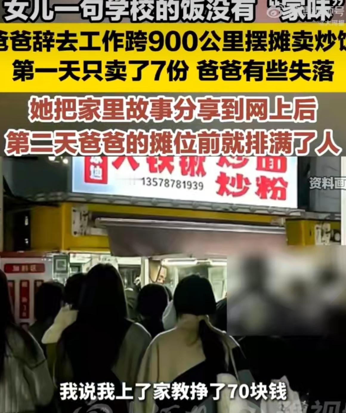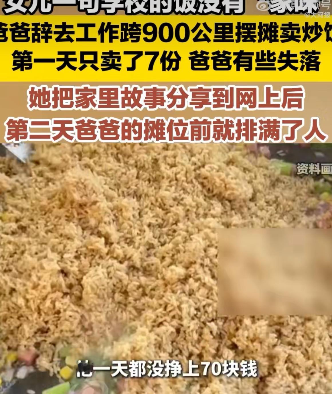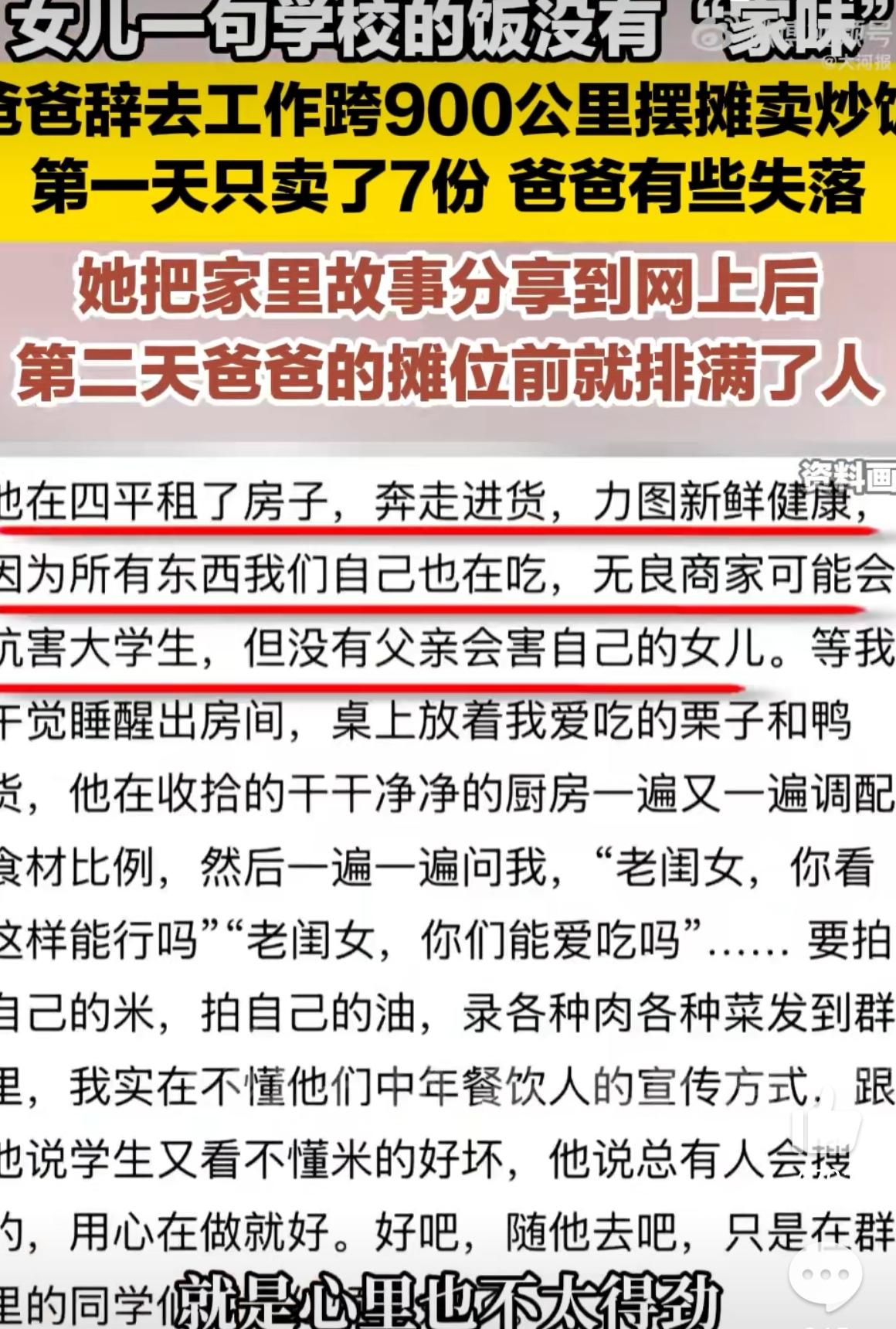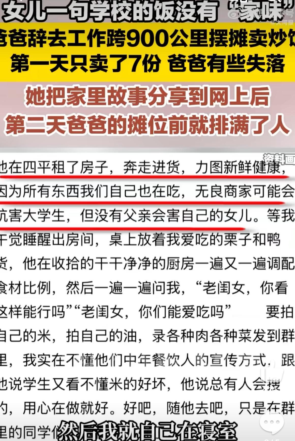 【暖心故事快讯】“家味炒饭”火了!长春老爸为女儿跨城摆摊,父爱牌美食引全网打卡 你见过为了孩子直接辞职、跨越900公里,只为做一份有“家味”的饭吗?吉林长春一位超级老爸,用行动告诉我们啥叫硬核父爱。事情起因很简单——女儿在外读书,偶然一句“学校饭没有家里的味儿”,让这位老爸彻底放下手头的工作,打包行李,专程赶到女儿学校附近,支起了自己的炒饭摊。 刚开摊那天,摊位生意 ** ,只卖出了7份炒饭,老爸心里不是滋味。但小姑娘转念一想,把爸爸的“家味行动”发到了社交平台,还配上照片和温馨小文。没想到第二天起床再去,看见摊位前排长龙,场面堪比“下饺子”——不仅同学们被吸引来打卡,连校外路人都来尝鲜,这份炒饭一夜之间成了校园爆款。 网友纷纷点赞:这就是最温暖的父爱啊!只为孩子的一句话,能放下一切,赶赴千里之外。不仅给年少女儿送去了家的味道,也让无数身在异地的年轻人感受到亲情的厚度。这份热乎乎的炒饭,品的不只是家味,更是拼劲十足的爸爸温度。 今天,“家味炒饭摊”已成为网络新晋打卡点,一份炒饭,一份情感,让大家集体感叹:这样的父爱,确实靠谱又硬核!