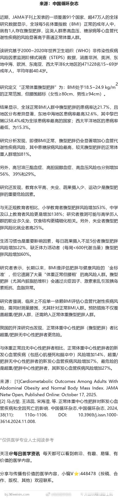 近期,JAMA子刊上发表的一项覆盖91个国家、超47万人的全球研究数据显示,全球每5名体重指数(BMI)正常的成年人中,就有1人存在腹型肥胖,这类人群患高血压、糖尿病等心血管代谢性疾病的风险显著高于普通正常体重人群。