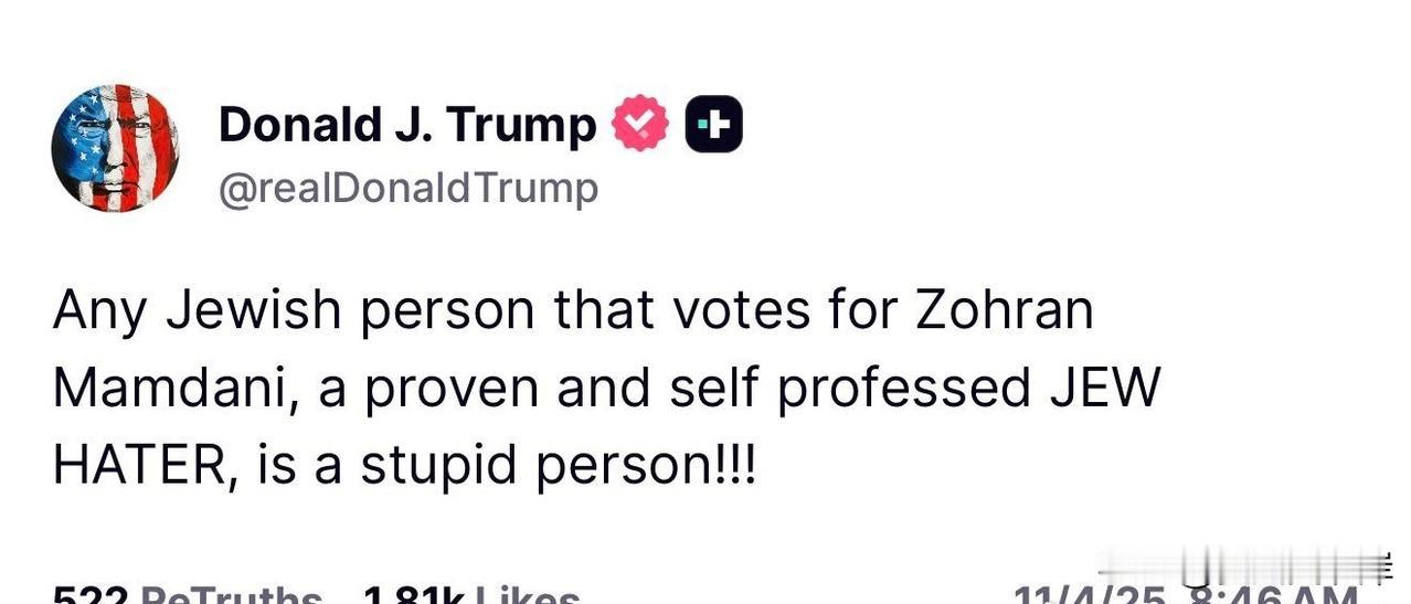 川普发文贬低支持Zohran的犹太人,称这些人都是愚蠢的。 “任何投票给Zohran Mamdani的犹太人,都是一个愚蠢的人!!!他是一个已被证实、且自称是仇恨犹太人的人!”