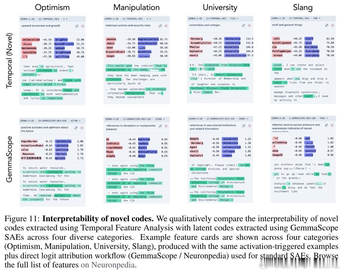 - 新颖成分仍保持传统SAE的自动可解释性,可生成清晰的语义特征卡片。
