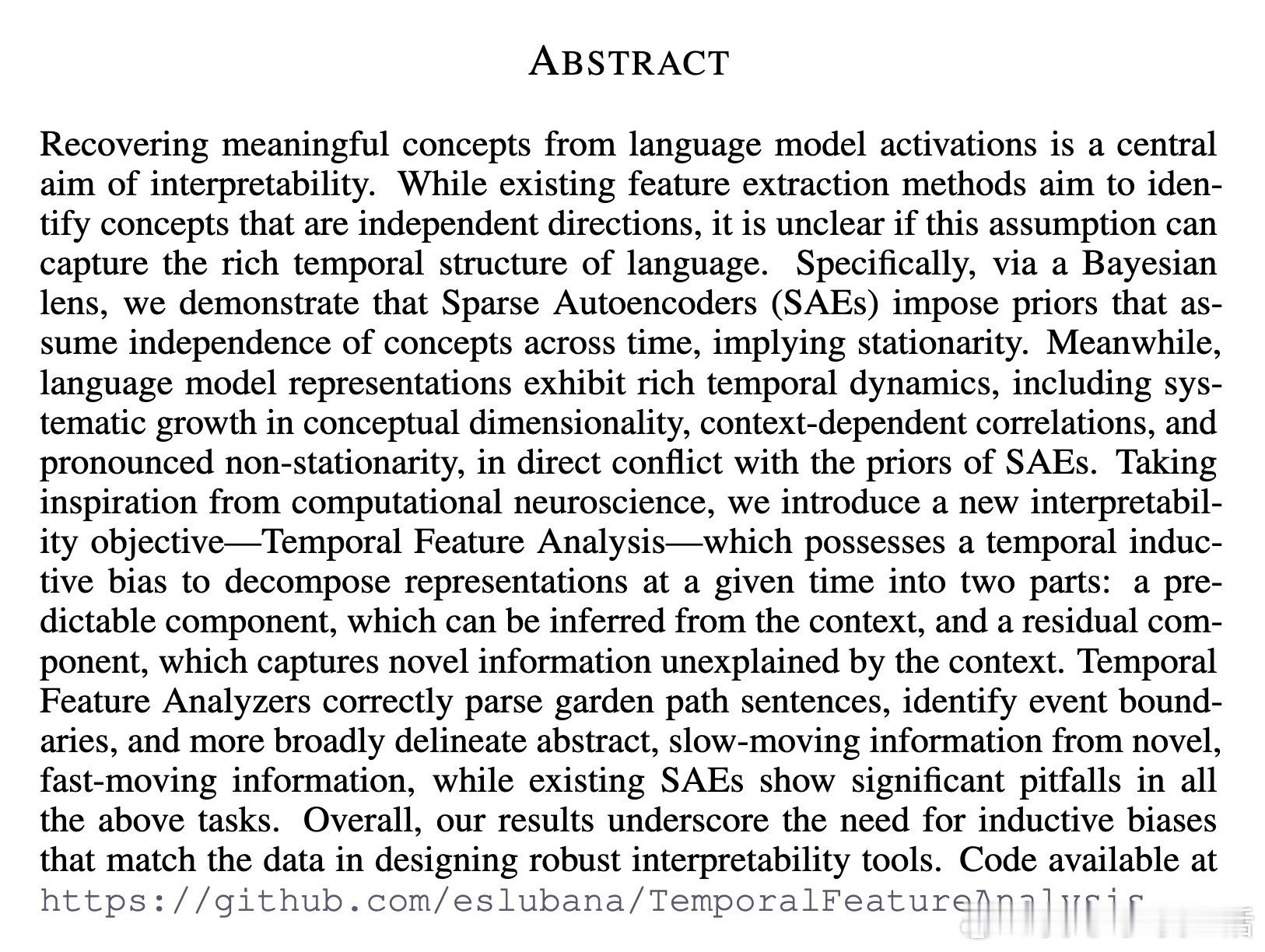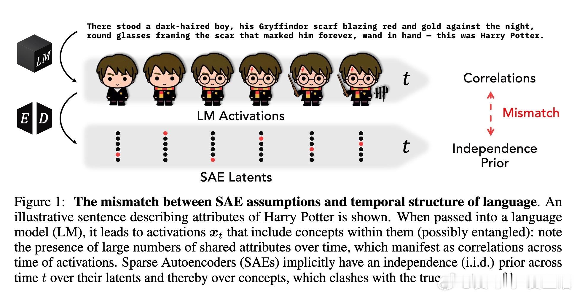 - 传统SAEs的时间独立先验与语言模型激活的时间相关性不匹配,限制了其解释能力。