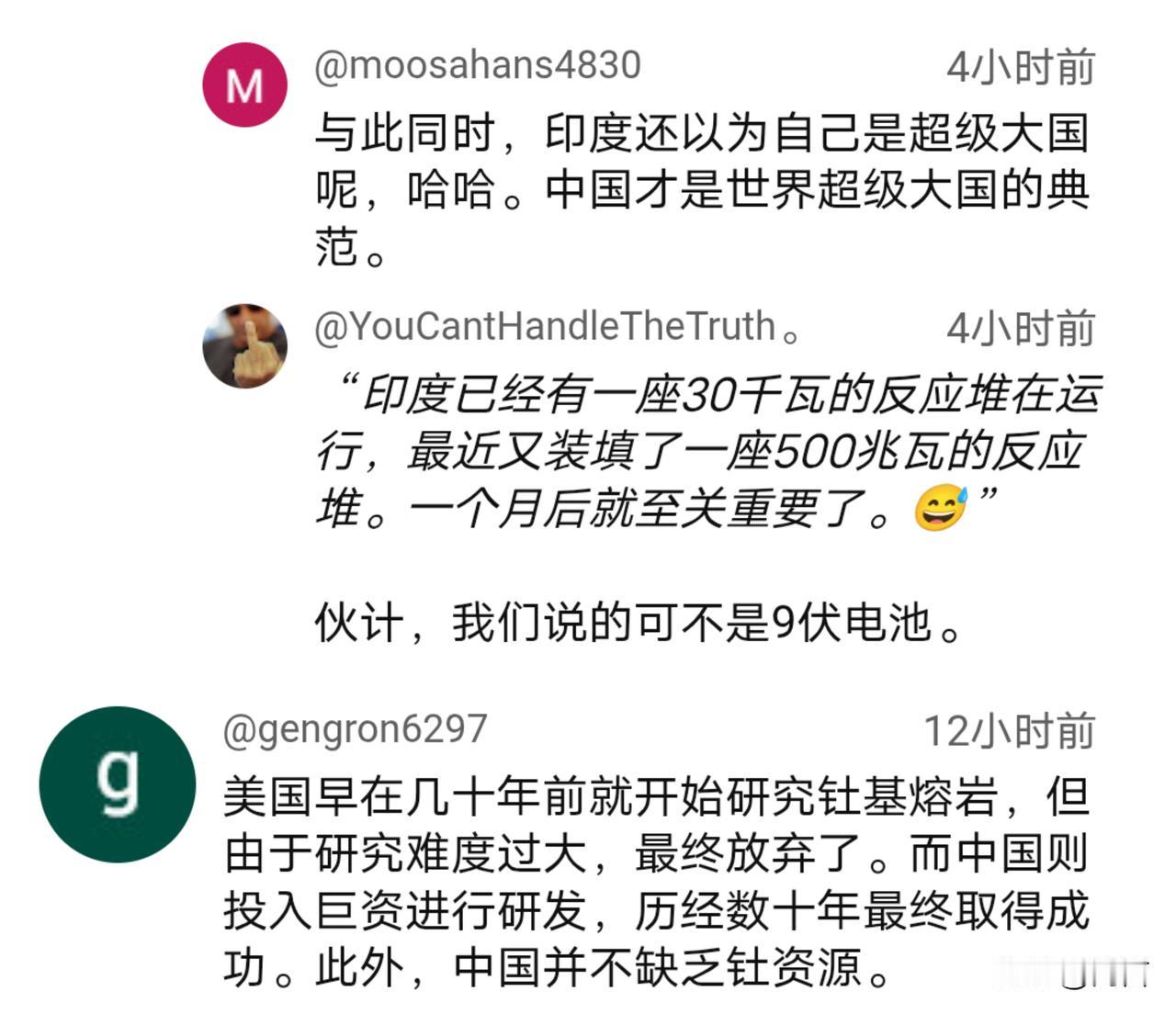 印媒:中国通过从钍中培育铀,实现了能源独立的里程碑!印网友:印度已经掌握了同样的技术。 近日,中国科学院上海物理研究所在戈壁开发的反应堆成功了实现从钍到铀的燃料转化。印媒于昨日对此进行了报道,并表示:此次技术突破,为近乎近无限的核能供应铺平了道路。 消息传出,引发热议。看见我国科技成果一接一个的涌现,印网友不淡定了,就有人连忙表示道:印度已经建造了同样反应堆。殊不知,其所言的是传统核反应堆,而掌握钍盐反应堆的目前只有我们一家。 谁都希望自己国家的科技能够突飞猛进,并掌握最先进的技术,印度网友自然也不例外。不过,想要得偿所愿,印度还有较长的路要走…