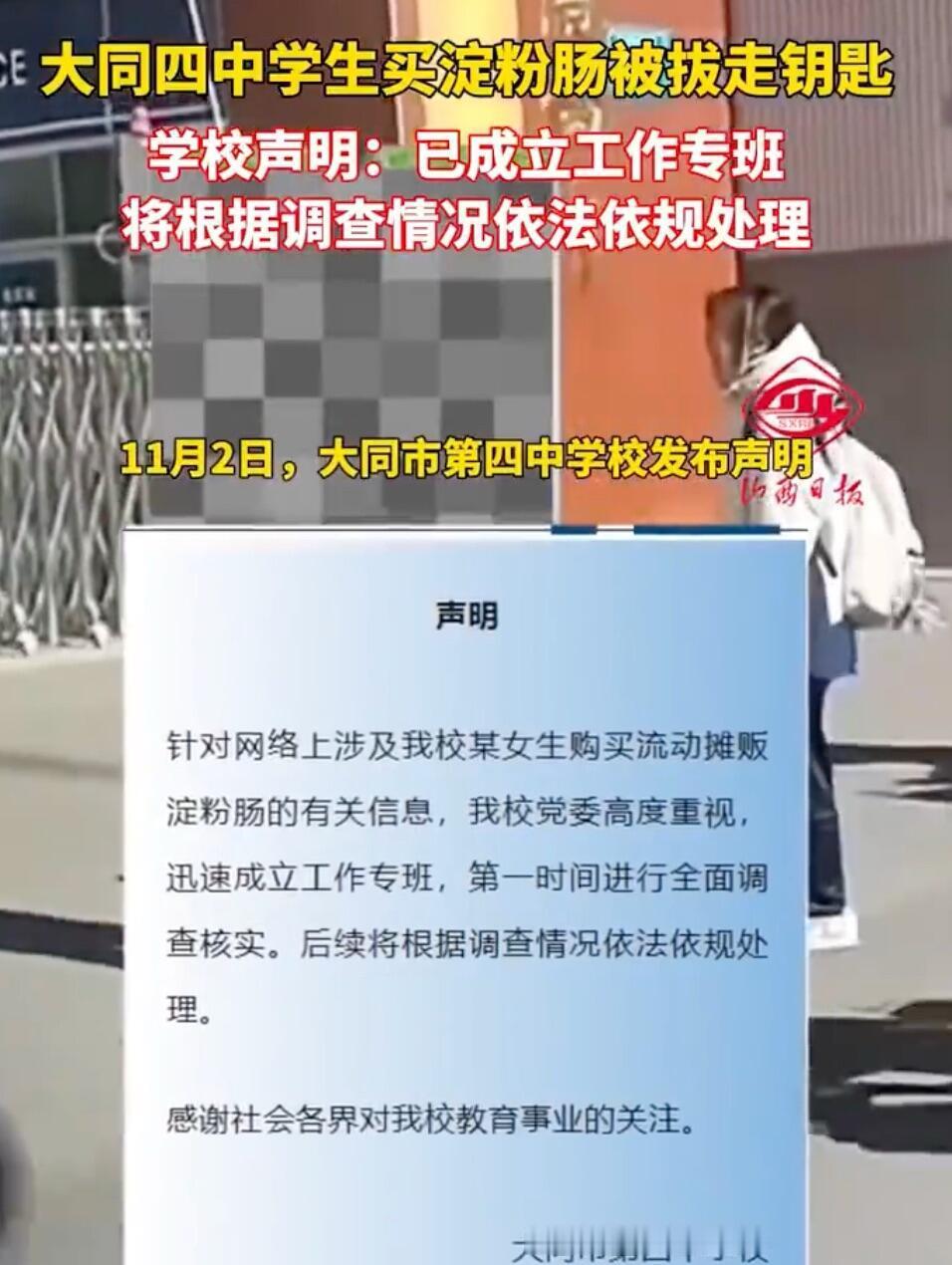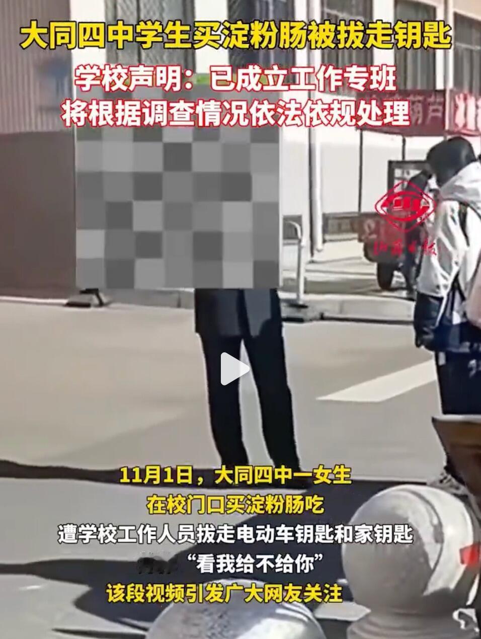 这事儿听着就让人来气。一个女生在校门口买了根淀粉肠,结果被副校长强行收走了电动车钥匙和家门钥匙。 网上那视频看得更憋屈,女生急得直哭,喊着“还给我”,那个穿绿背心的副校长愣是不给,还甩出一句“看我给不给你”,然后就往学校里走。这哪像个校领导干出来的事?好多网友都说,这对一个孩子来说,简直跟天塌了一样。 事情闹大后,学校在11月4号发了通报,才把情况说清楚点儿。原来是中午放学人多,这女生买吃的时把电动车停在了通道上,副校长劝她离开没成功,就直接拔了车钥匙,两人就这么吵起来了。 要我说,这事儿两边确实都有问题。女生停车堵路不对,但你一个副校长,用拔钥匙这种方式来处理,也太简单粗暴了,这不激化矛盾吗?而且,律师都说了,这属于越权违法,侵犯学生权益。私人物品是受法律保护的,学校没权力随便收缴。 后来学校也承认双方都有不当行为,经过批评教育,互相谅解了,钥匙当时就还了。 其实说到底,校门口流动摊贩的管理是个老难题。像安徽就明确规定过,学校门口两百米内都不允许有食品摊贩,就是怕食品安全和交通拥堵这些问题。估计大同四中也是出于类似的管理考虑,但方法用错了。 这件事说到底,学校管理不能光图自己省事,就不顾学生的感受。教育学生,得讲究个方法和尊重。