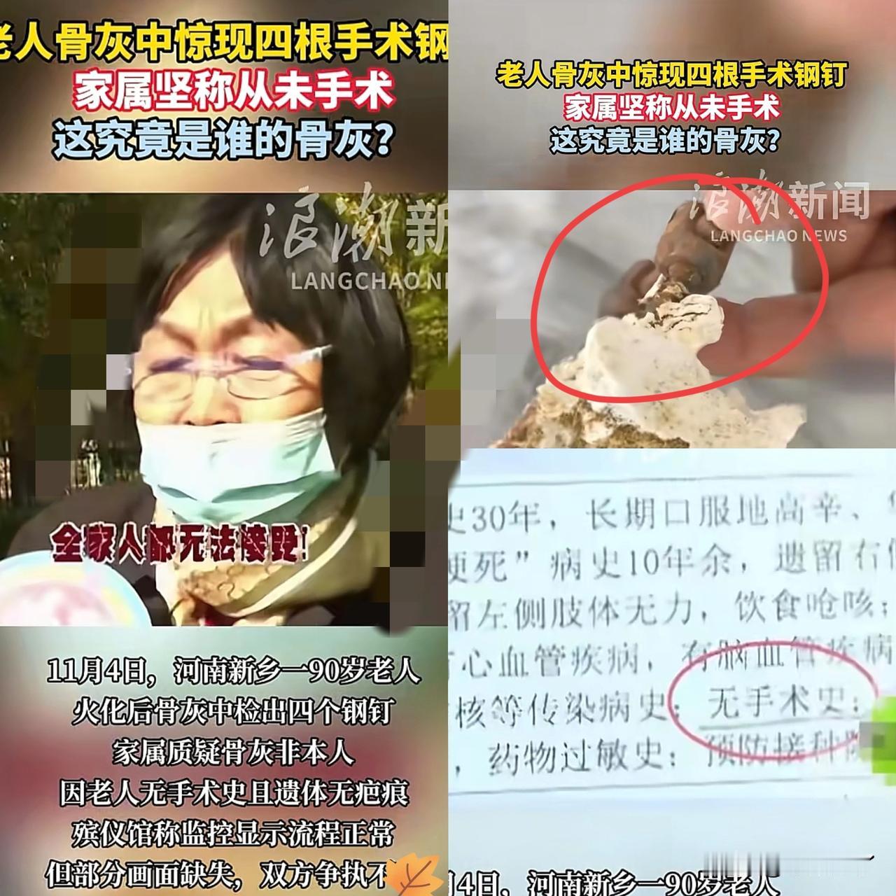 河南一90岁老人因病去世,家人将其火化后,骨灰里竟然莫名多出4个钢钉?殡仪馆说做过手术,可家属天天给老人擦身,连个疤痕都没有,医院证明更是白纸黑字写着“无手术史”! 更气人的是,家属要查监控对质,关键画面居然“线路老化”没记录,所谓的“闭环管理”,纯属自欺欺人! 别拿“钢钉耐高温”找借口,这根本不是科学问题,是态度问题! 正规火化流程,核对身份、清理炉膛都是基本操作,连这都做不到,谈何对逝者尊重? 这4颗钢钉,戳碎的不只是家属的念想,更是殡葬行业的底线! 逝者连最后一程都不得安宁,监控缺失、流程失守的账,到底该谁来算? 殡仪馆说流程没问题,家属说骨灰不是老人,这到底怎么回事?