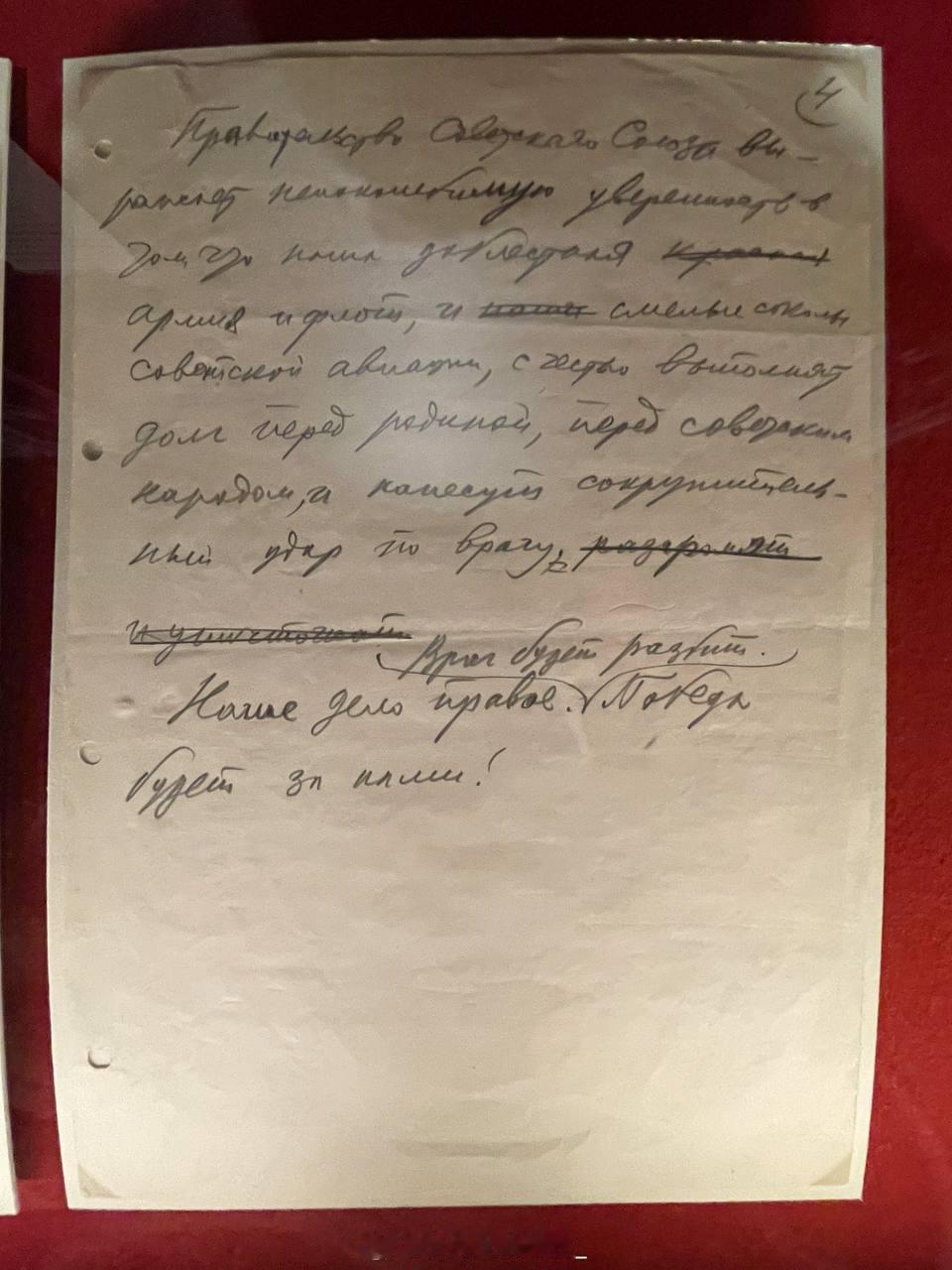 📃 展陈中不乏英雄遗物:卓娅·科斯莫杰米扬斯卡娅的记事本、飞行员阿列克谢·马雷斯耶夫的授奖令、狙击手柳德米拉·帕夫利琴科的呢绒军大衣。