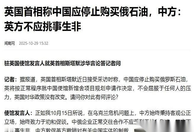 笑死,刚刷到个新闻。 英国那个什么领袖,跟特朗普通了个电话,俩人一合计,隔空喊话,说不许中国再买俄罗斯的石油了。 说这样就能断了俄罗斯的钱袋子,仗就打不下去。 我天,这是一种什么样的脑回路? 真当全世界都得围着你转,你一句话,别人就得自断手脚来配合你的“正义”? 拜托,大哥,看看现实吧。 你们不买,有的是人抢着买。印度现在买成了第一大客户,买得不亦乐乎。土耳其、巴西,队伍排得老长了。人家俄罗斯的生意,早就做到五湖四海去了。 更逗的是,你们自己呢? 欧洲去年冬天取暖费涨成什么样了?老百姓冻得直哆嗦的时候,没见你们心疼啊。工厂因为能源太贵,要么关门要么搬家,这又是谁的锅? 哦,对了,美国倒是赚翻了。一边高喊着“大家跟我上”,一边把自家的天然气高价卖给欧洲盟友,这生意经念得可真好。 现在回过头来,指着我们说三道四? 说白了,我们买俄罗斯的油,这事儿再简单不过了。 我们国家这么大,这么多人,发展要用电,开车要加油,一日三餐要开火,哪样离得开能源? 邻居家的东西,质优价廉,管道直接送到家门口,省钱省力。这笔账,小学生都会算。我们省下来的每一分钱,最后都是实实在在落到我们每个老百姓头上的。 这不叫“资助战争”,这叫“过日子”。 真想让那边消停,就别总想着怎么拉别人下水,怎么让别人给你那些失败的政策买单。 坐下来,好好谈。 想靠施压和甩锅来解决问题,最后只会发现,小丑是自己。