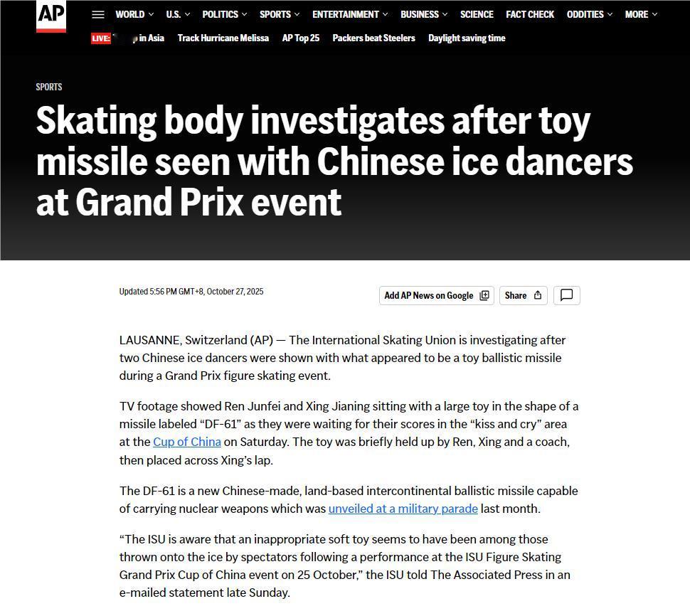 西方人破防了,西媒要求对中国选手禁赛……实际这个东风61玩具并不是两个中国选手自己带的,是表演结束后观众席上的观众投向场地内的众多玩具之一,被两名选手捡起来后带到了休息区。